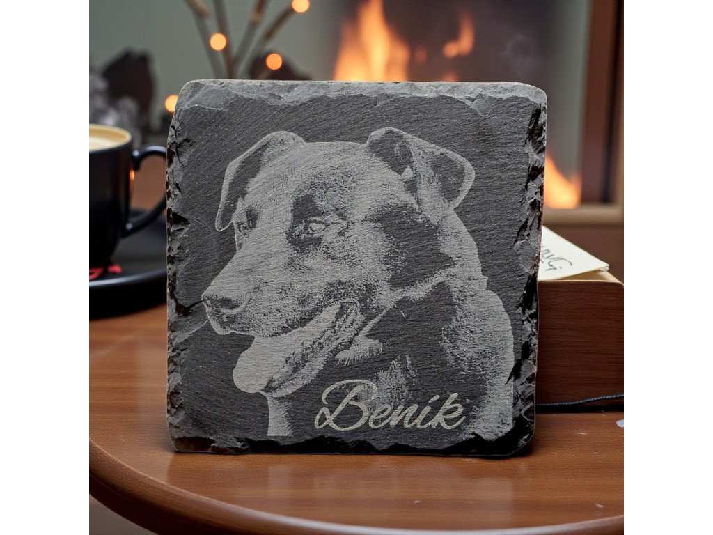 Pomocí precizní laserové technologie vygravírujeme na břidlici fotografii vašeho pejska, kočky nebo jakéhokoliv jiného mazlíčka, a to včetně jména či krátkého textu. Každý kus břidlice má svou unikátní strukturu, což z každého podtácku činí neopakovatelný originál.