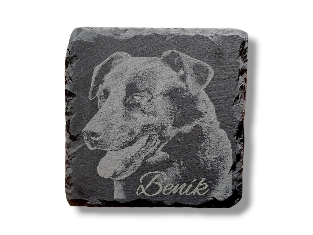 Unikátní břidlicový podtácek s vygravírovanou fotkou vašeho mazlíčka. Přírodní materiál, ruční zpracování a trvalá vzpomínka na zakázku vyrobí značka GRAVILAN.