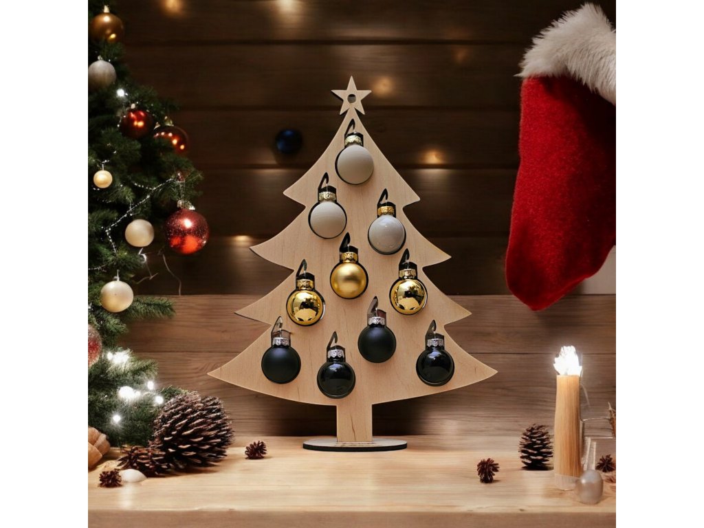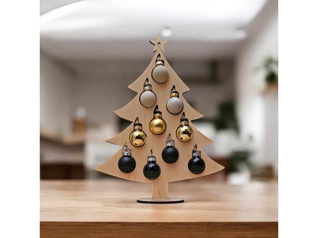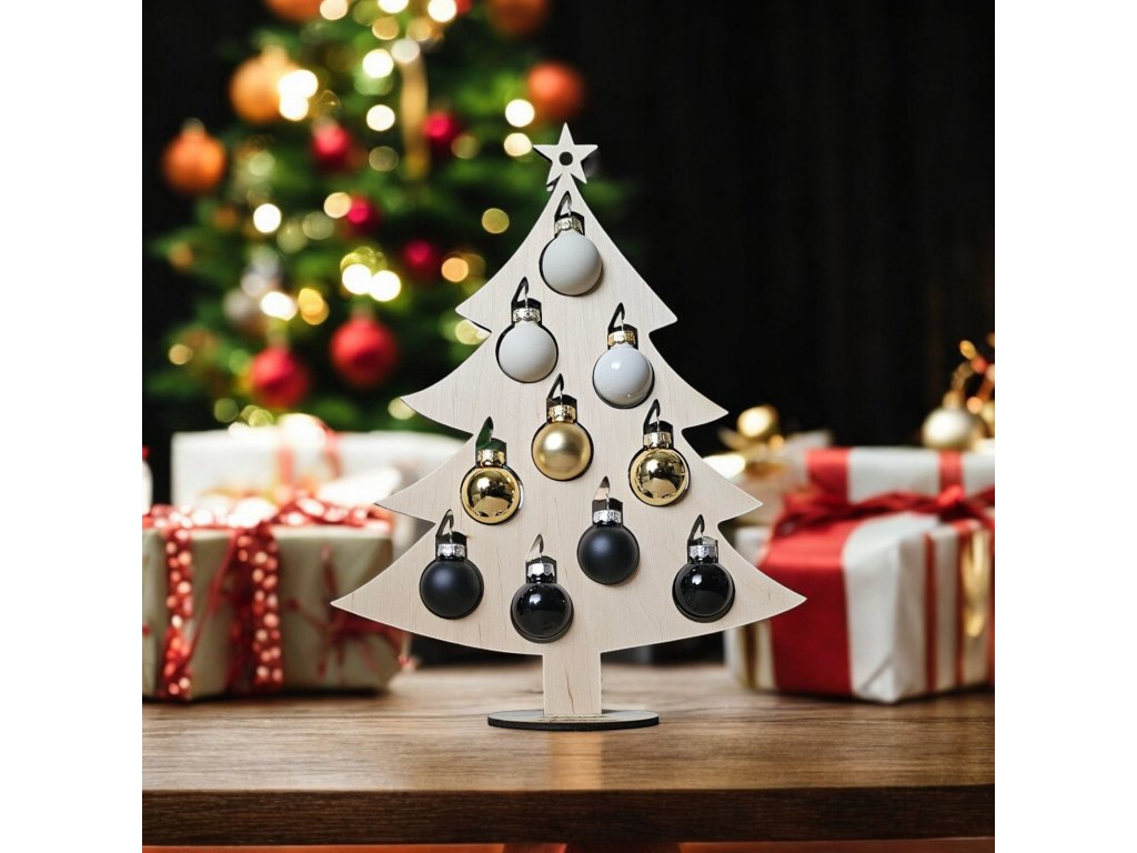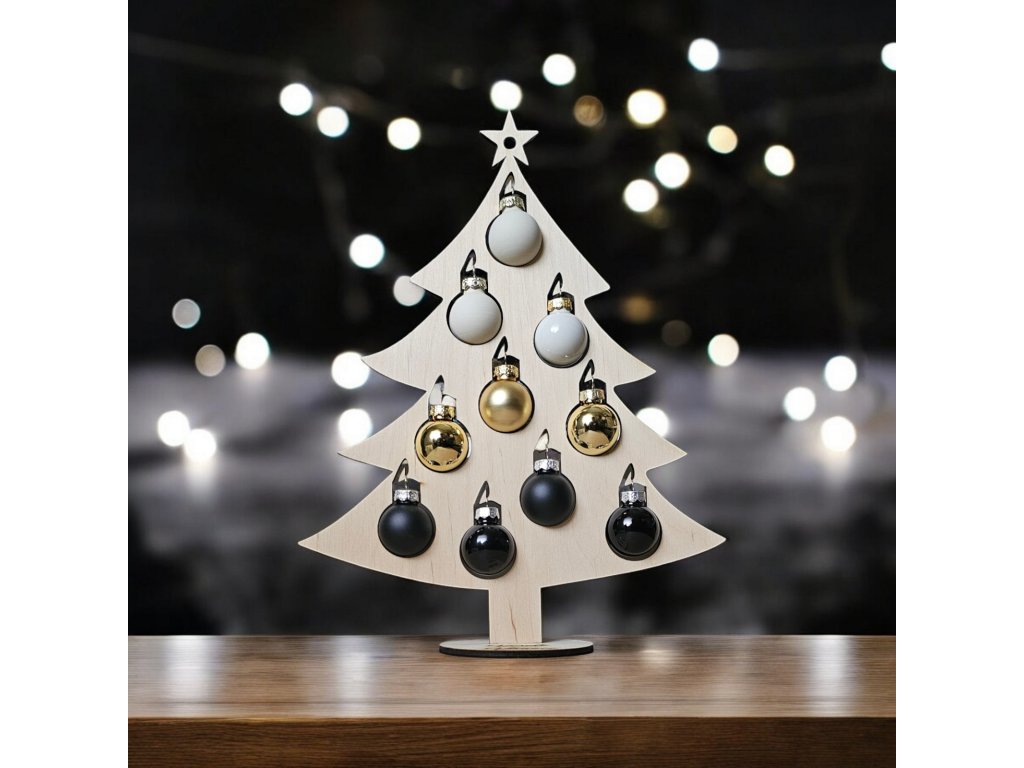 Jednoduchá a přírodní vánoční dekorace ve tvaru stromku z březové překližky. Součástí je 10 vyměnitelných skleněných ozdob. Výška cca 25 cm, šířka cca 20 cm. Vhodné na poličku, stůl i parapet.