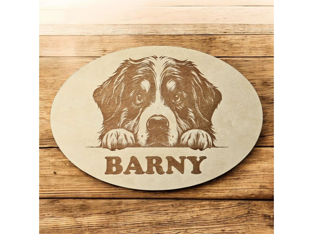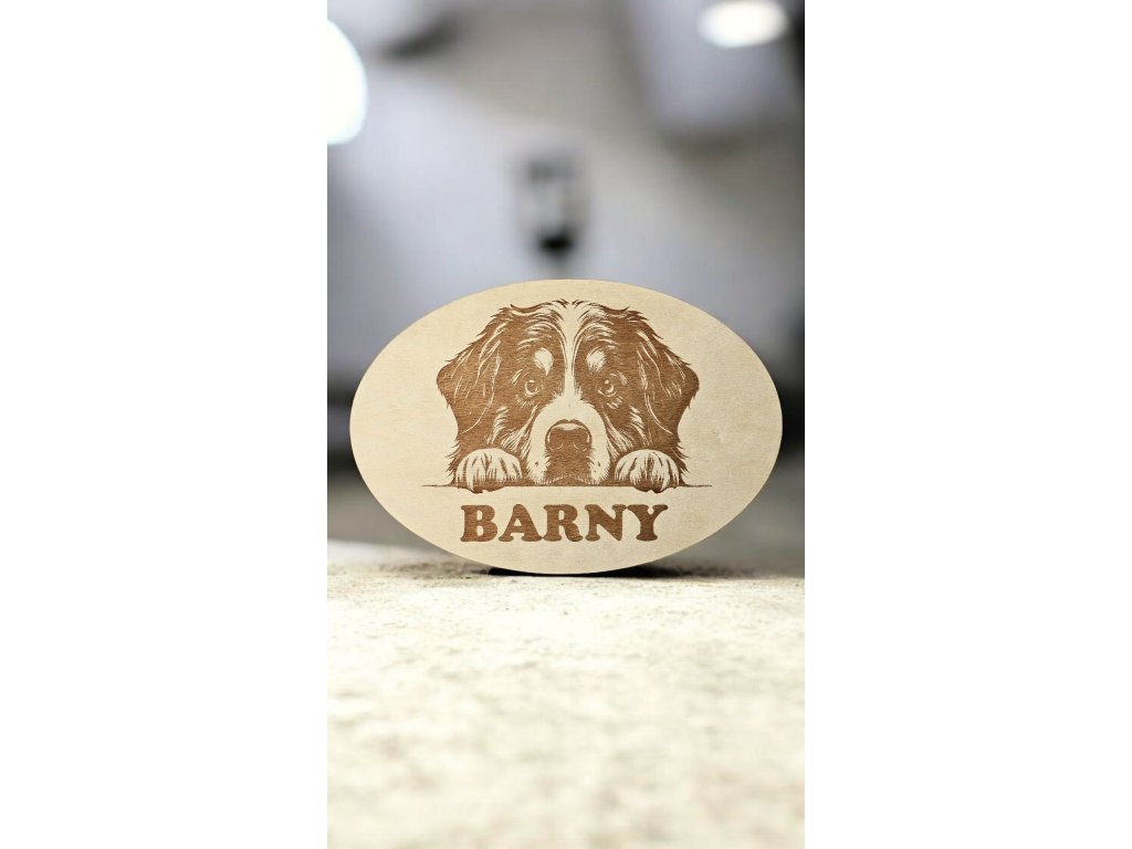 Personalizovaná dřevěná jmenovka s gravírovanou fotkou a jménem mazlíčka. Březová překližka 3 mm, šířka 25 cm. Dekorace od GRAVILAN.