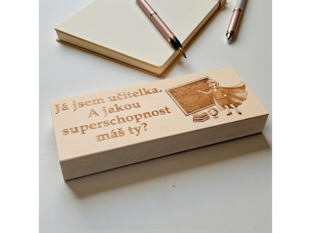 Originální dřevěný penál z borovicového dřeva s gravírovaným motivem pro pedagogy. Praktický i vtipný dárek na konec školního roku nebo ke dni učitelů.