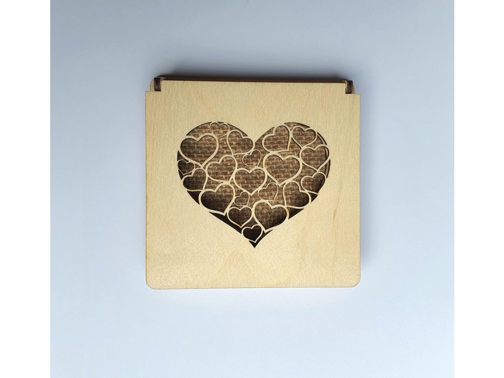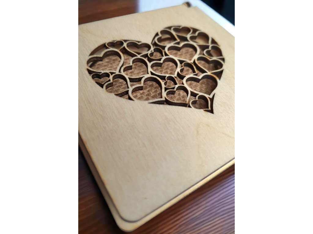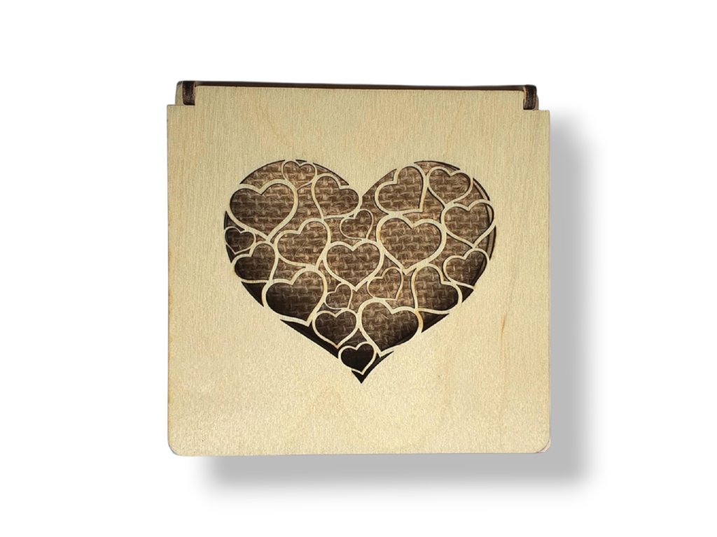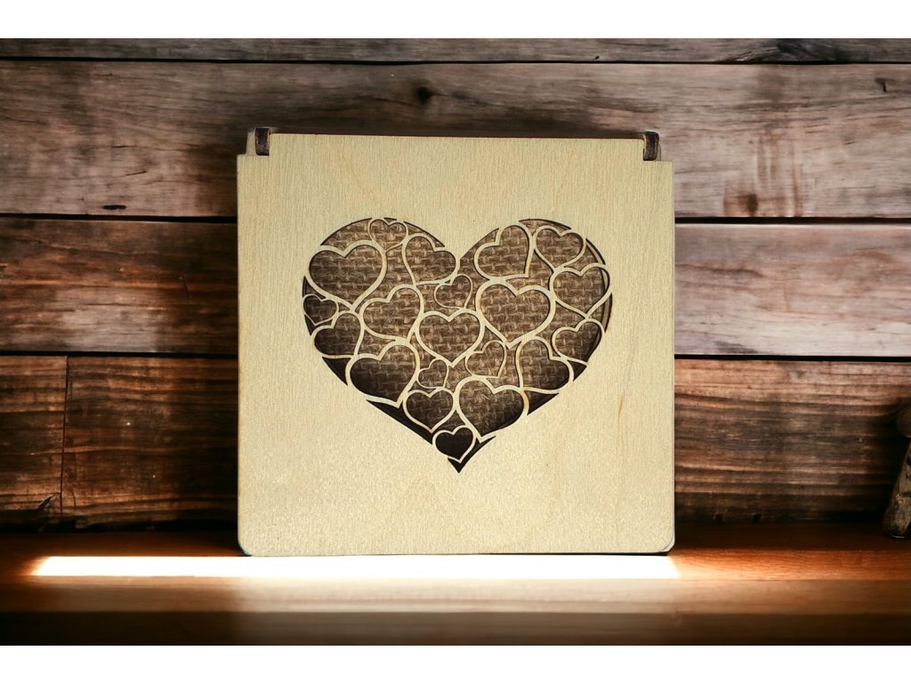 Tato jemně opracovaná dřevěná krabička je navržena pro bezpečné a stylové uložení snubních prstýnků, ale skvěle poslouží i pro jiné drobné šperky. Je vyrobena z kvalitní březové překližky, která jí dodává přírodní a čistý vzhled. Horní víko zdobí precizní výřez v motivu srdcí, skrz který může prosvítat vnitřní výplň.