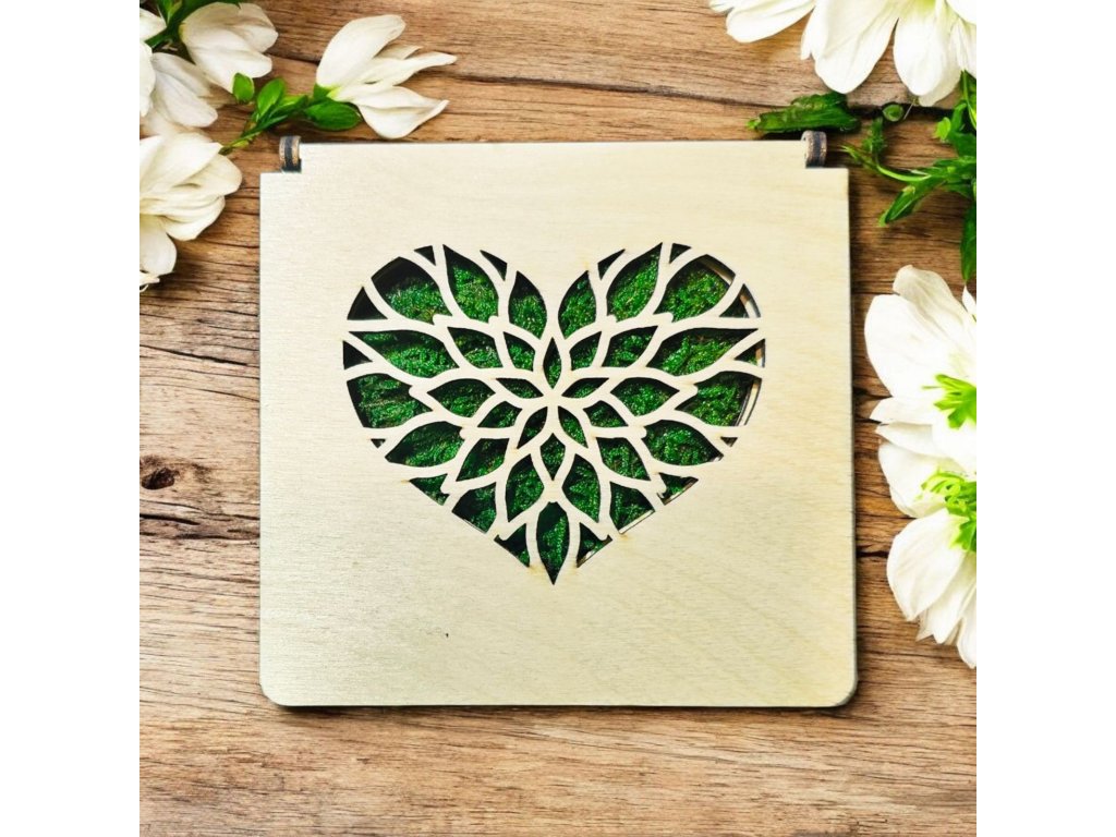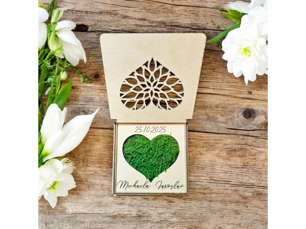 Uvnitř krabičky se nachází srdíčko ze stabilizovaného mechu, který si dlouhodobě zachovává svou svěží zelenou barvu i texturu – bez nutnosti údržby. Mech je jemný, příjemný na dotek a krásně drží snubní prstýnky na svém místě.