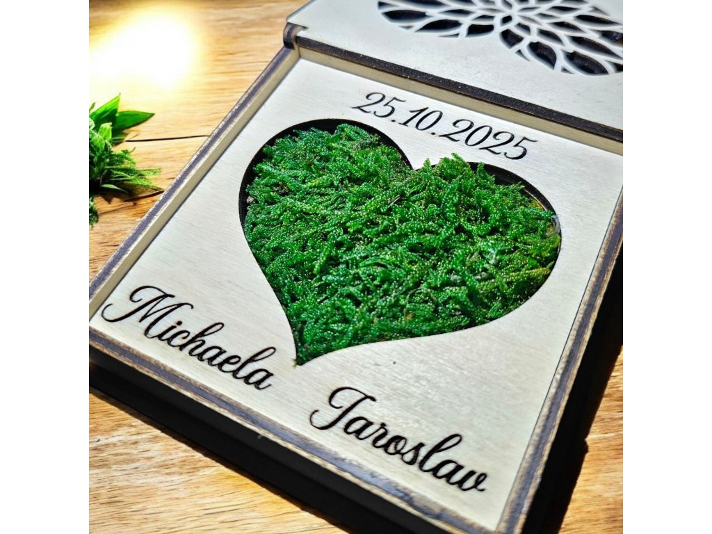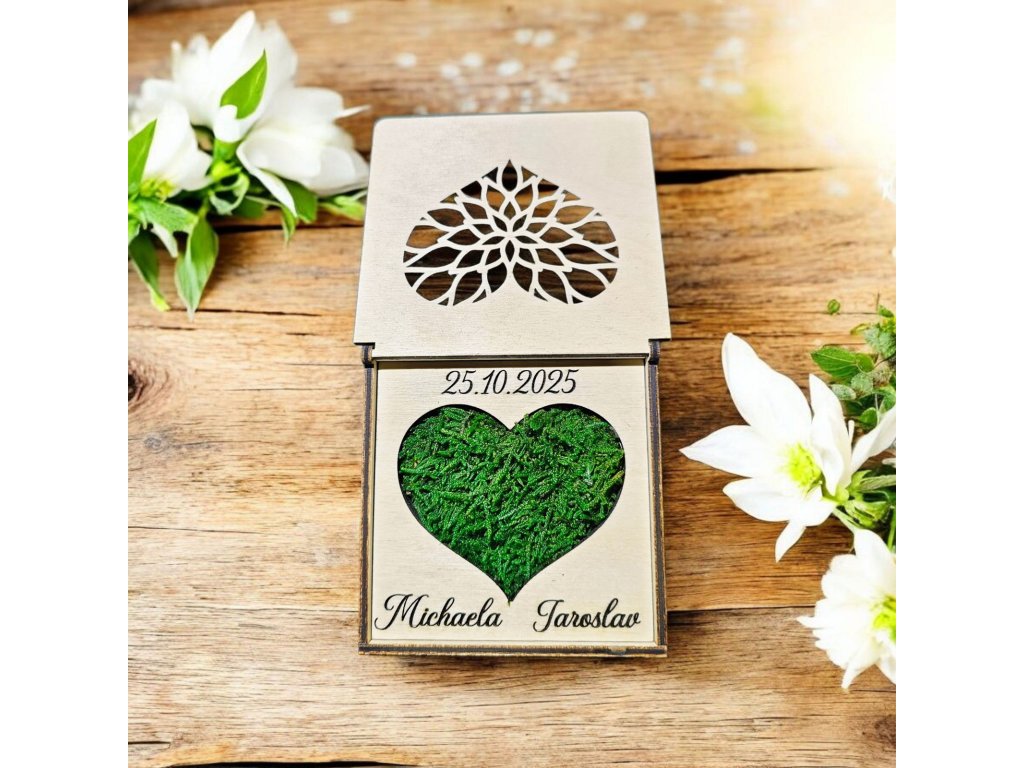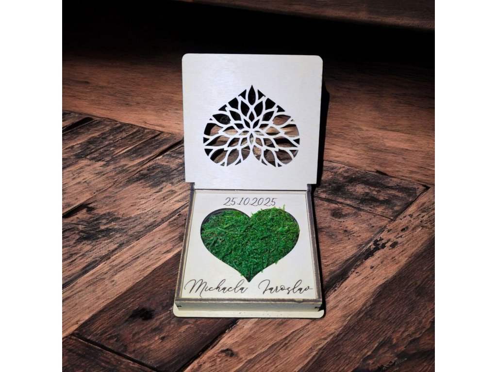 Dřevěná krabička na snubní prstýnky se srdíčkem ze stabilizovaného mechu.