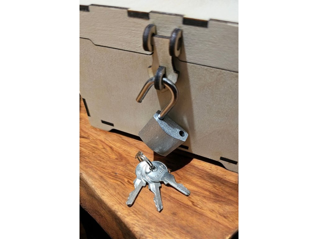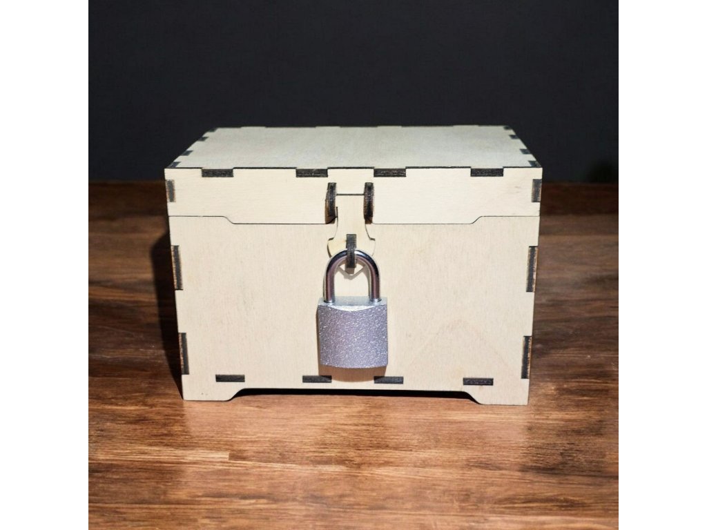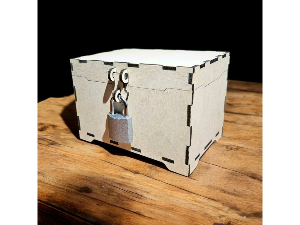 Dřevěná krabička s výklopným víkem a možností uzamčení, vyrobená z březové překližky, s rozměry 13 × 9 × 9 cm.