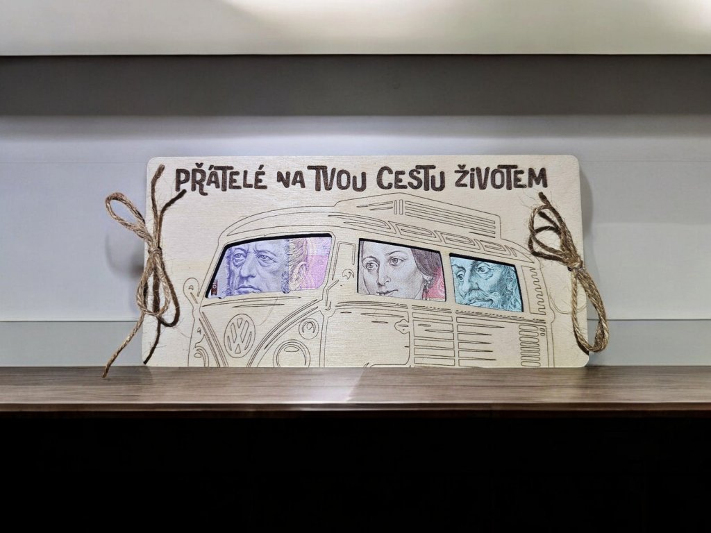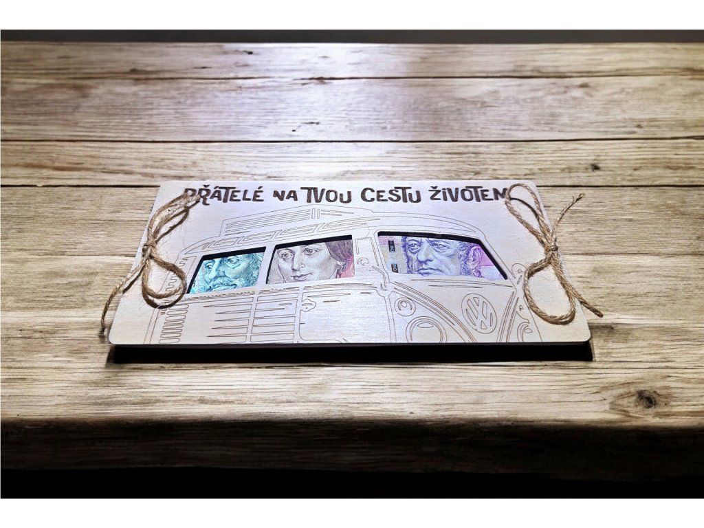 Originální dřevěná obálka na peníze – elegantní způsob, jak zabalit peníze pro cestovatele. Ručně vyráběné z překližky s gravírováním textu či motivu.