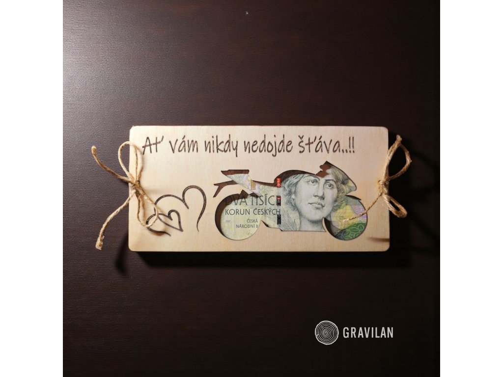 Dřevěná obálka na peníze s motivem motorky – originální dárek pro morkáře. Laserová překližka, česká ruční výroba Gravilan.