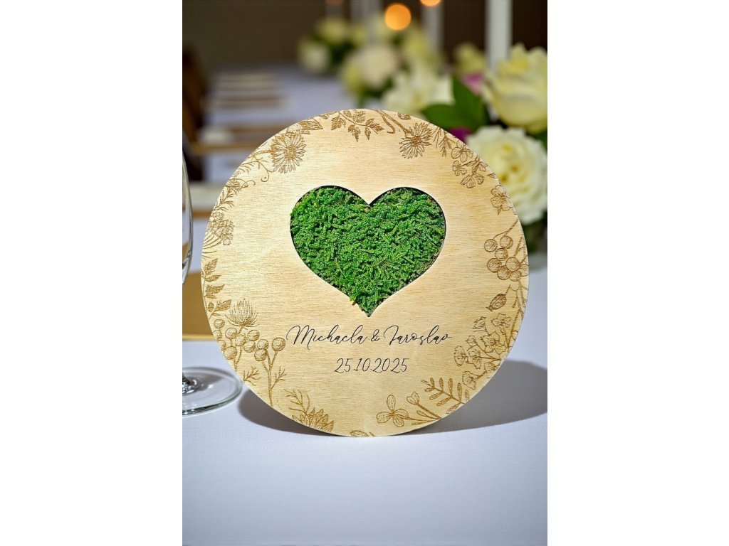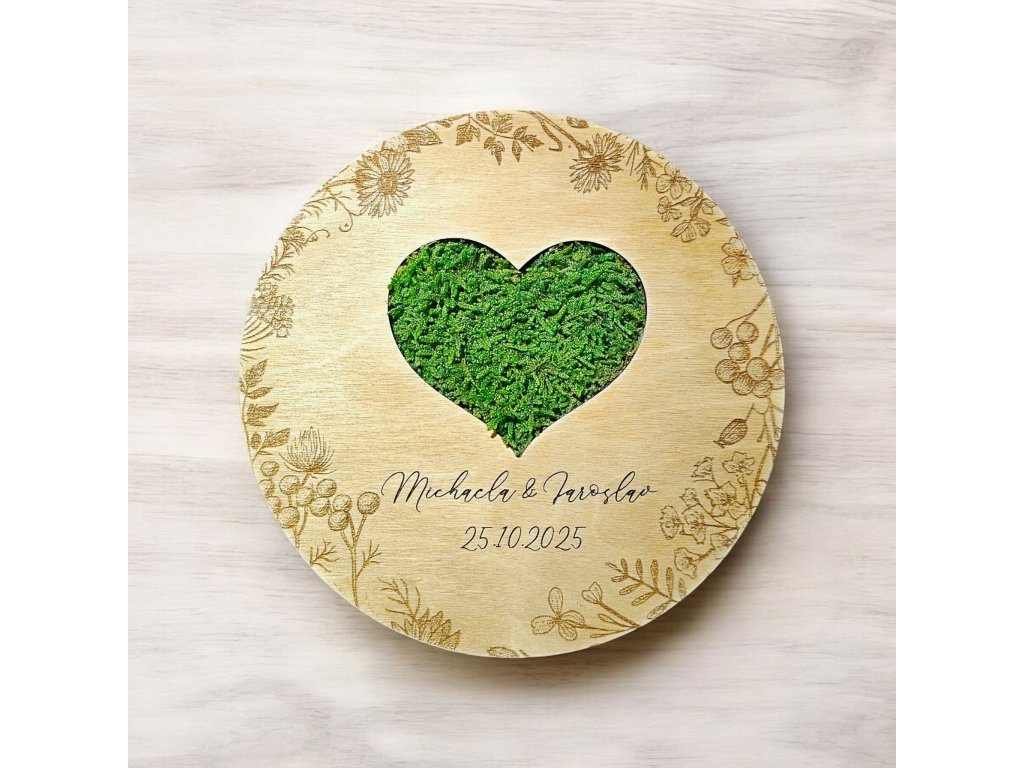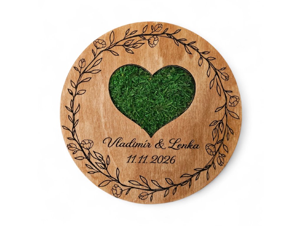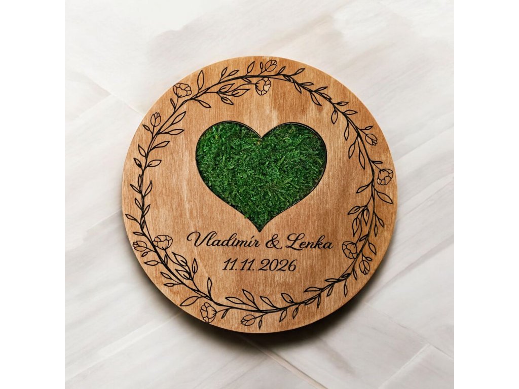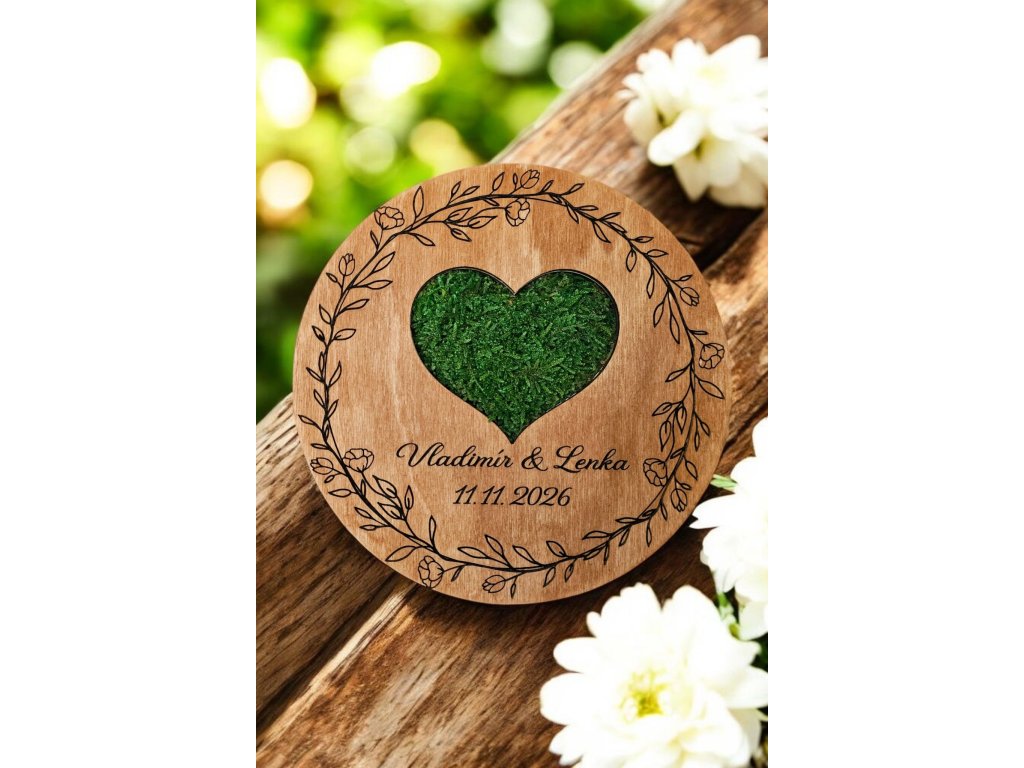 Tato dřevěná podložka pro svatební prstýnky je ideální doplněk pro váš svatební den – stylově s přírodním motivem mechu, který dodává jedinečný ráz.