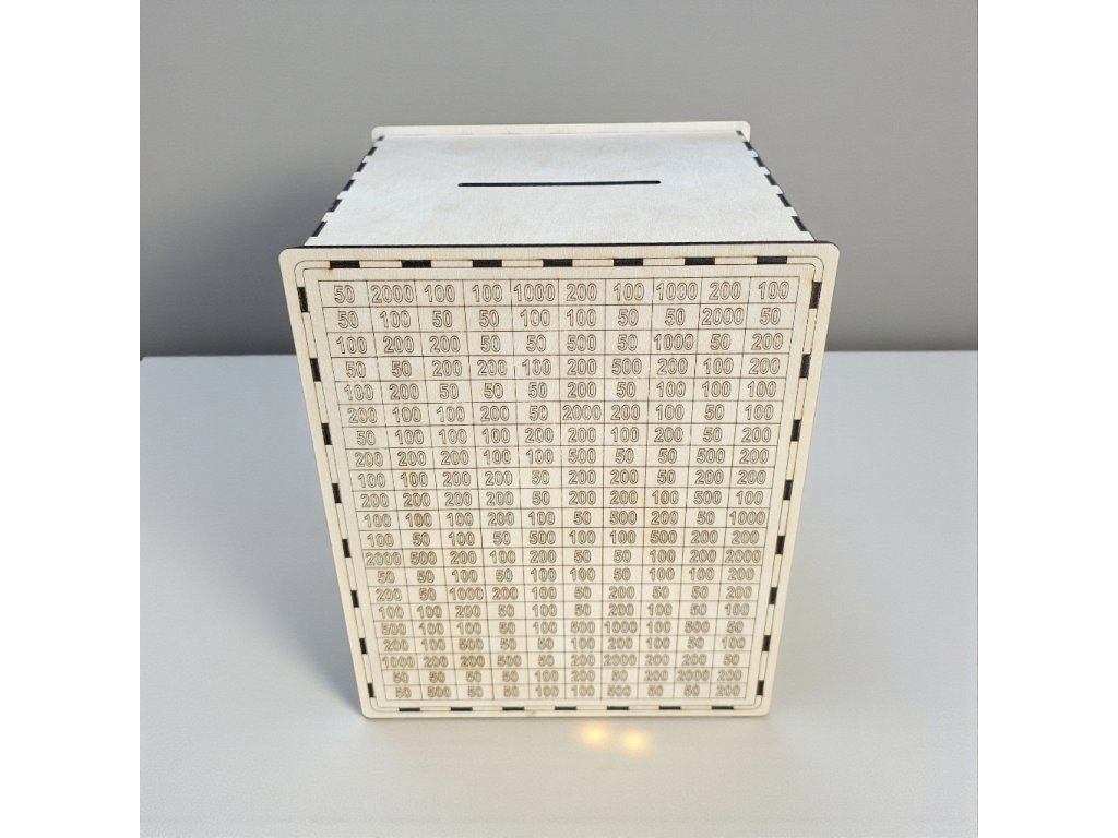 Tato dřevěná škrtací pokladnička s cílem 100 000 Kč je praktickým a přehledným nástrojem pro každého, kdo si chce vědomě a systematicky našetřit konkrétní částku. Na rozdíl od klasické pokladničky zde přesně vidíte, kolik už máte splněno a kolik vás ještě čeká.