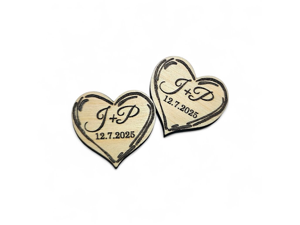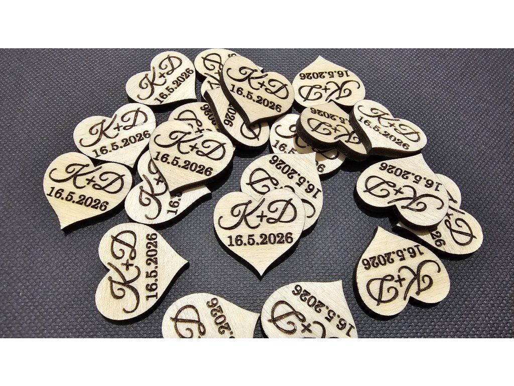 Každé srdíčko může být doplněno o gravírování podle vašeho přání – nejčastěji iniciály snoubenců, datum svatby nebo krátký text. Díky přesnému laserovému gravírování je každý motiv čistý, ostrý a trvale vypálený.
