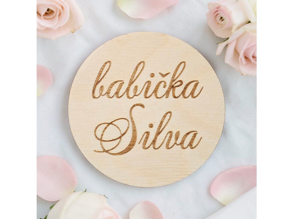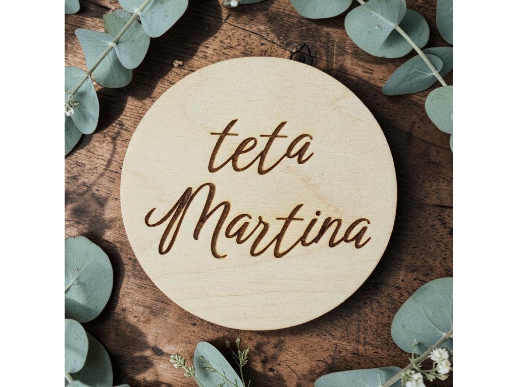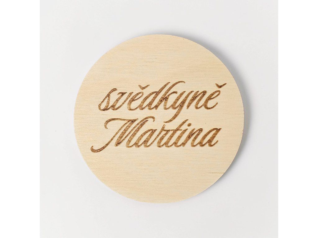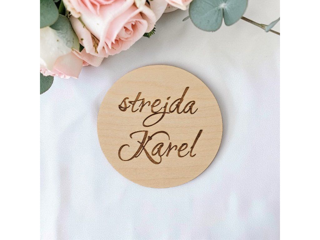 Díky průměru 9 cm jsou jmenovky dominantním, ale nevtíravým prvkem. Absence ornamentů a dalších údajů dovoluje vyniknout přirozené kresbě březové překližky a preciznímu laserovému gravírování. Tato varianta představuje dostupnější cestu k originálnímu svatebnímu detailu, aniž byste slevili z kvality řemeslného zpracování.