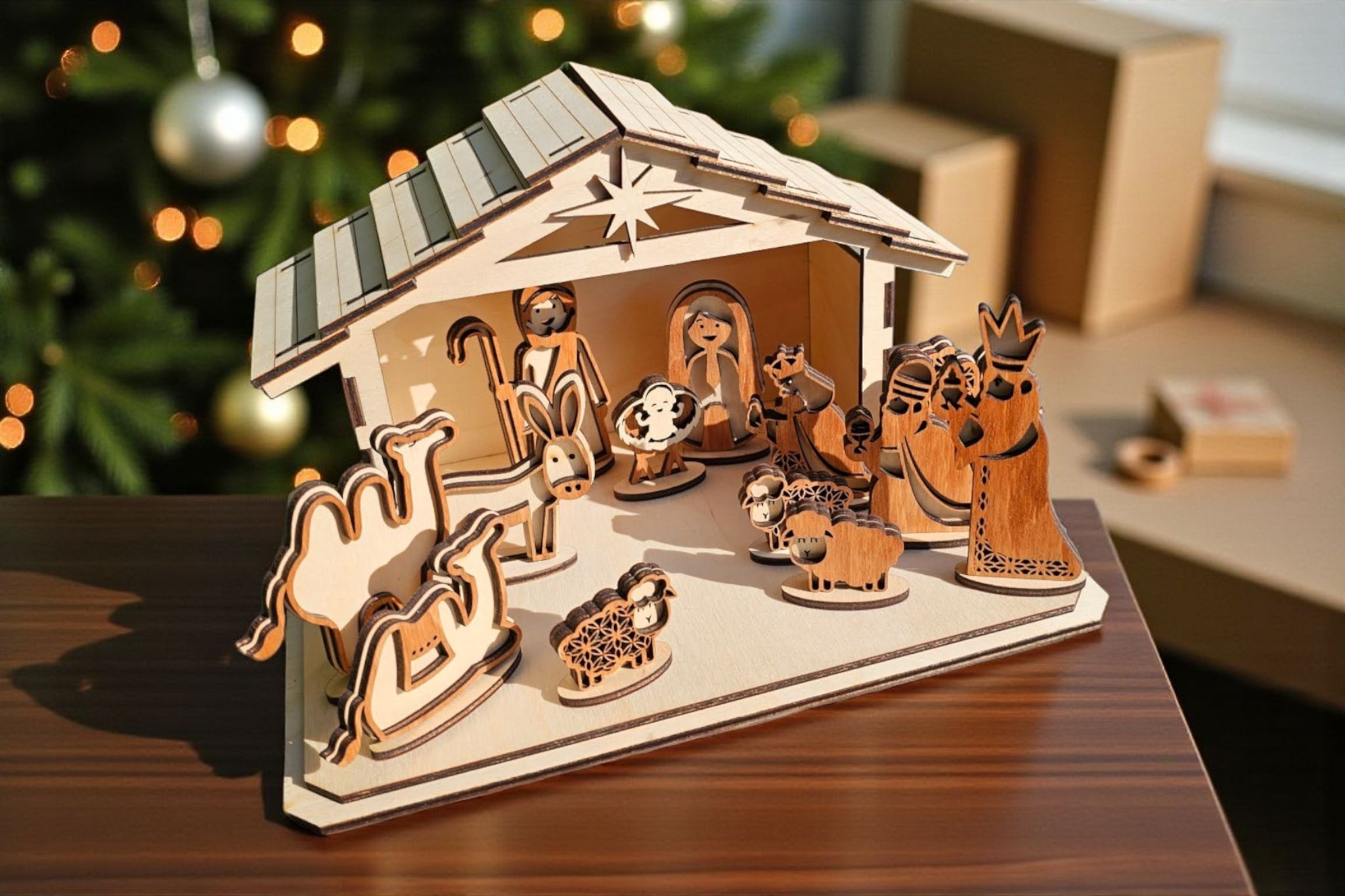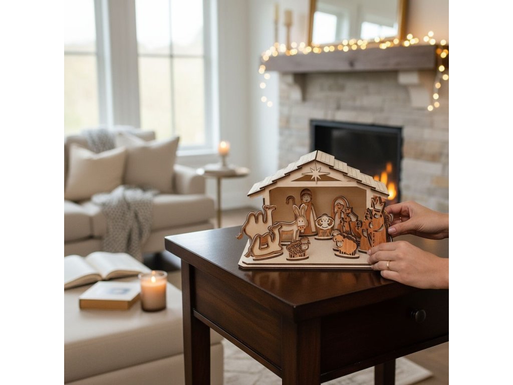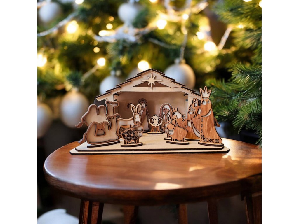 Ručně vyrobený dřevěný betlém z březové překližky — vánoční dekorace, která vnese do vašeho domova kouzlo Vánoc. Česká výroba.