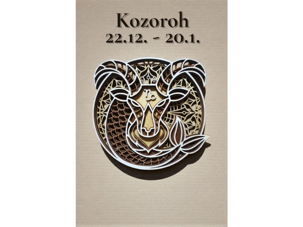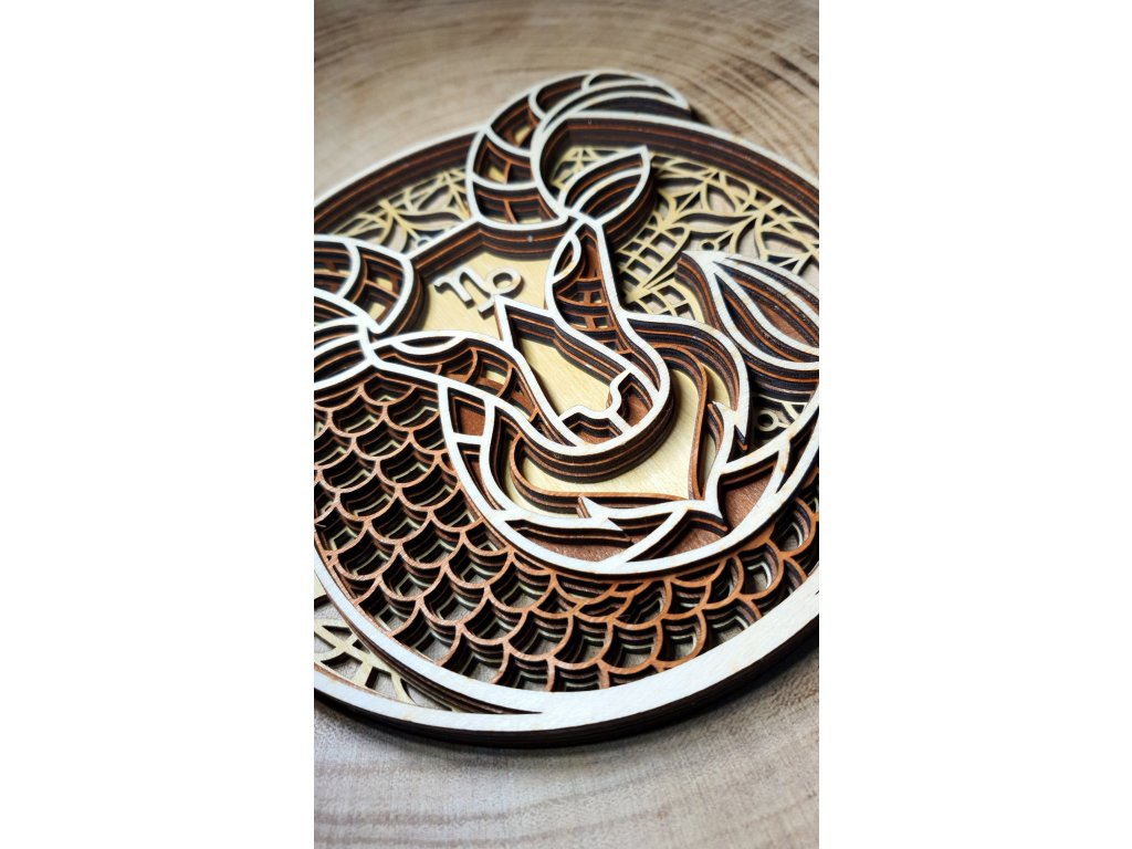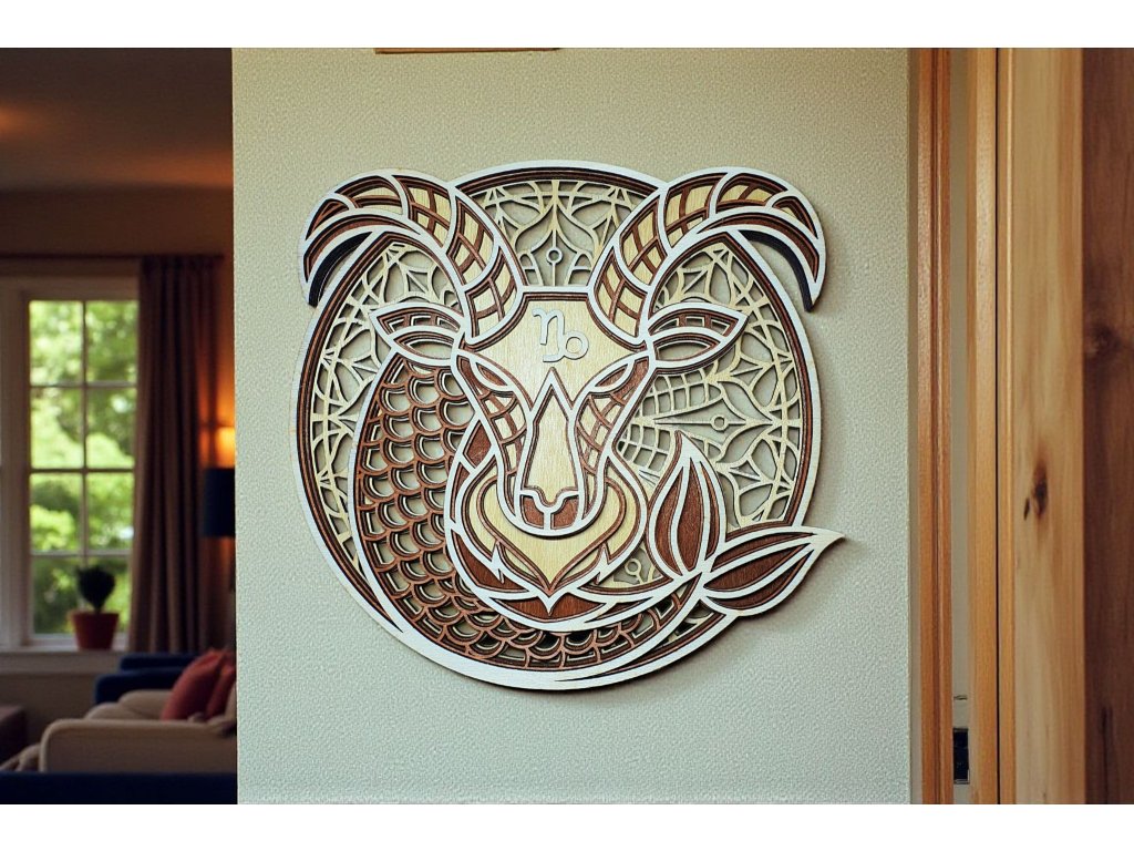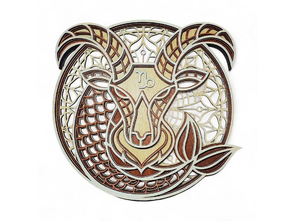 Dřevěný 3D obraz s motivem znamení zvěrokruhu Kozoroh. Vyrobeno z kvalitní březové překližky s detailním laserovým gravírováním. Elegantní přírodní dekorace do interiéru, ruční výroba v dílně Gravilan.