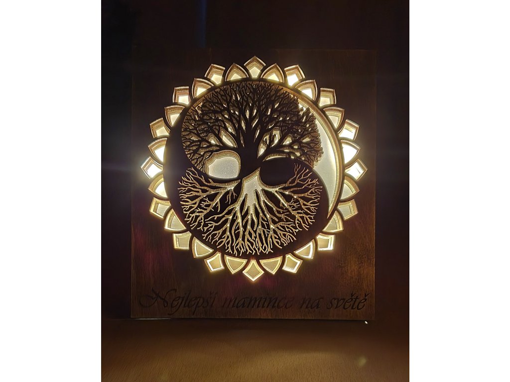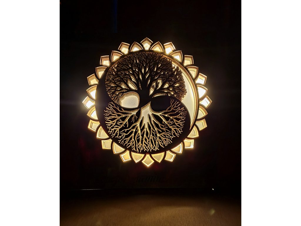Dřevěná svítící dekorace - strom života YIN YANG vyrobená ze šesti vrstev březové překližky.
