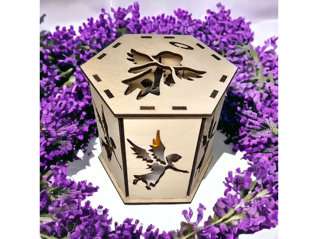 Dřevěný svícen se siluetou anděla z březové překližky. Součástí je LED čajová svíčka s teplým světlem. Rozměry cca 10×10 cm. Jemná, bezpečná a útulná dekorace.