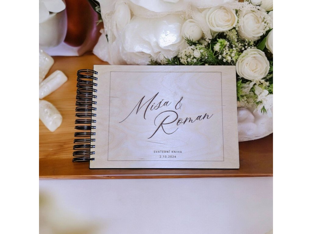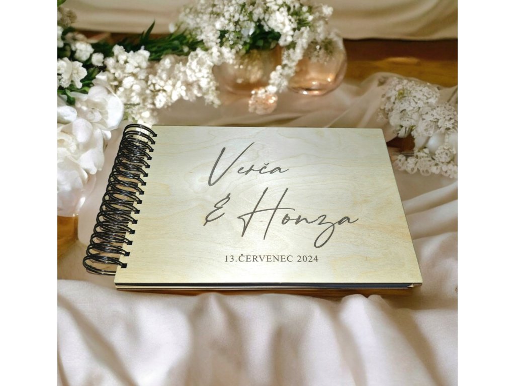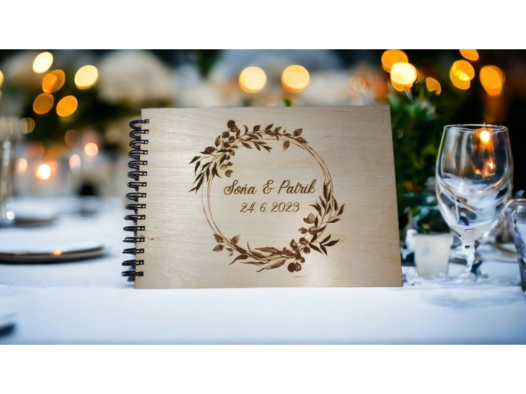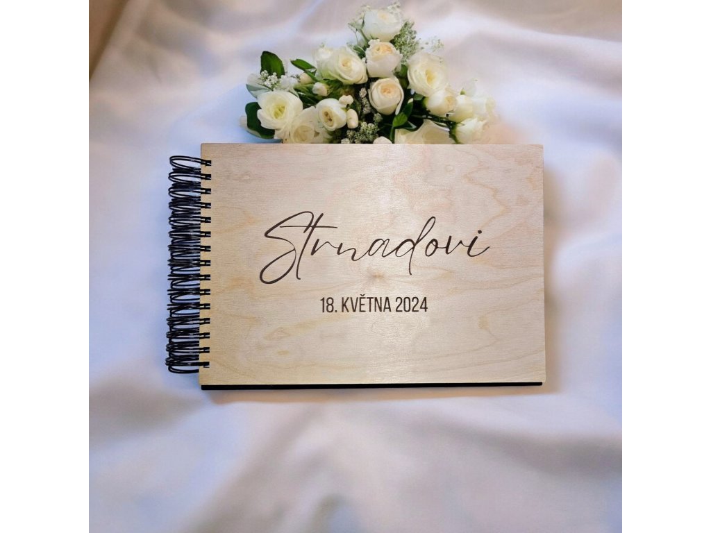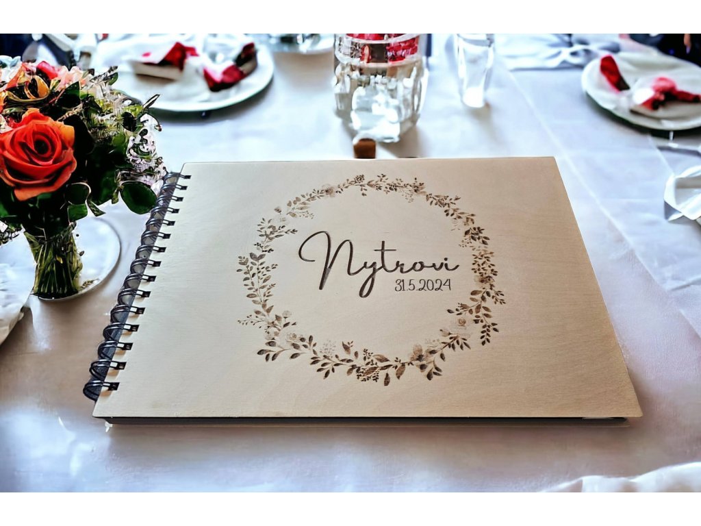 Elegantní dřevěné fotoalbum A4 s gravírováním na přání. Březová překližka, kovová kroužková vazba 38 mm, možnost personalizace jména, textu i motivu.