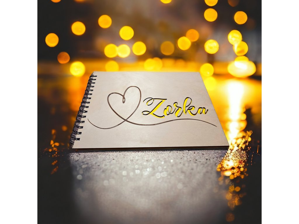 Elegantní dřevěné fotoalbum A4 s výřezem na přání. Březová překližka, kovová kroužková vazba 38 mm, možnost personalizace jména, textu i motivu.