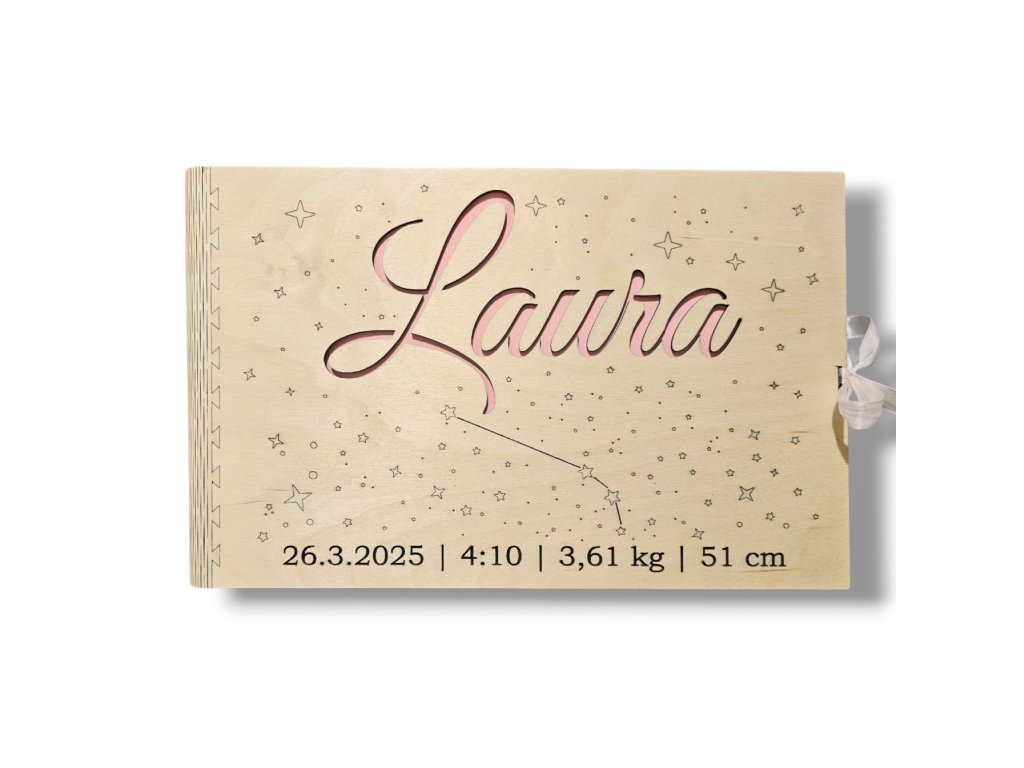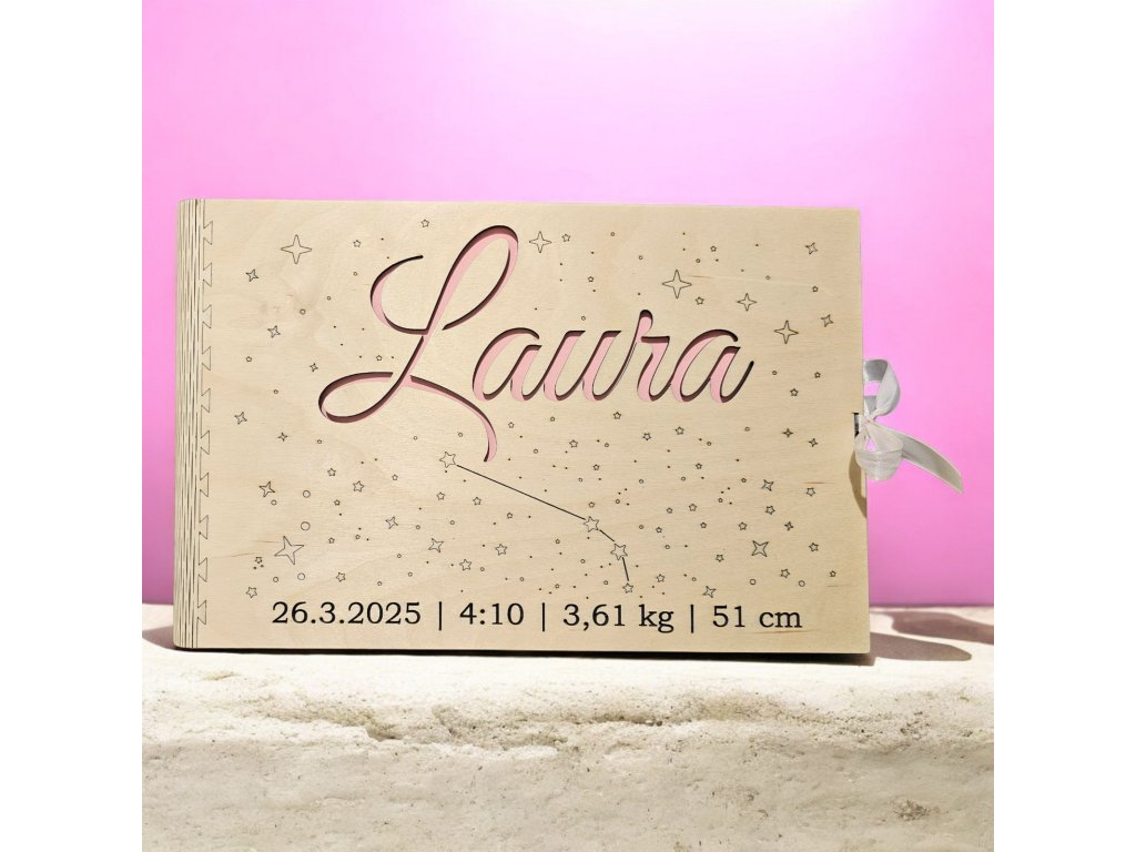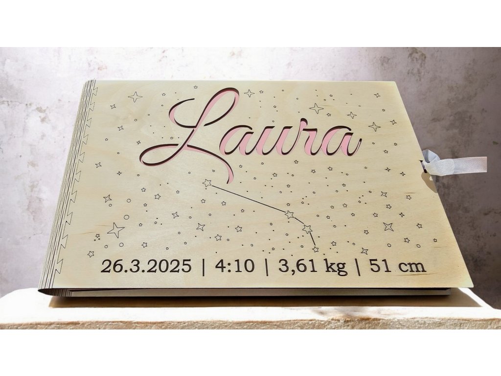 Dřevěné fotoalbum A4 s gravírováním a ozdobným výřezem je elegantní a osobitý doplněk pro zachycení těch nejdůležitějších vzpomínek. Díky pevným deskám z kvalitní březové překližky působí album luxusně, přírodně a velmi odolně.