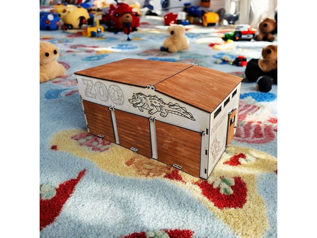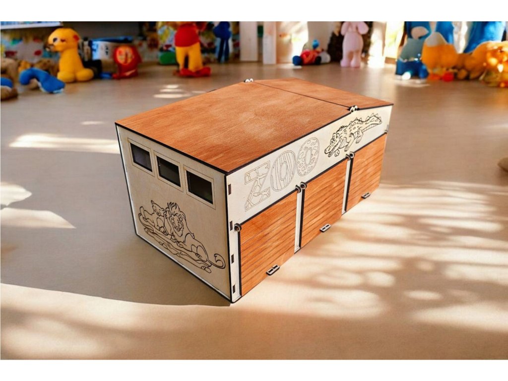 Dřevěná garáž pro tři autíčka vyrobená z kvalitní březové překližky, s otevíratelnými vraty, střechou a dveřmi. Rozměry cca 32,5 × 17,5 × 15,5 cm. Vhodná pro autíčka do velikosti cca 17 × 8,5 × 8,5 cm.