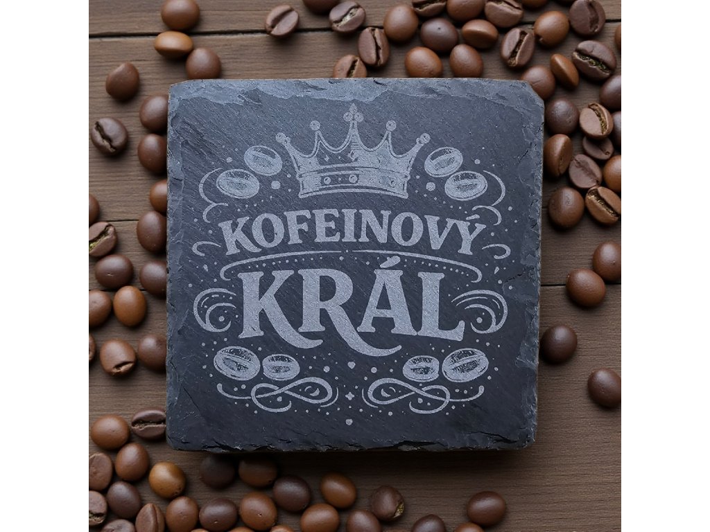 Stylový kávový podtácek z přírodní břidlice s gravírovaným motivem „KOFEINOVÝ KRÁL“. Praktický i dekorativní doplněk pro všechny milovníky kávy.