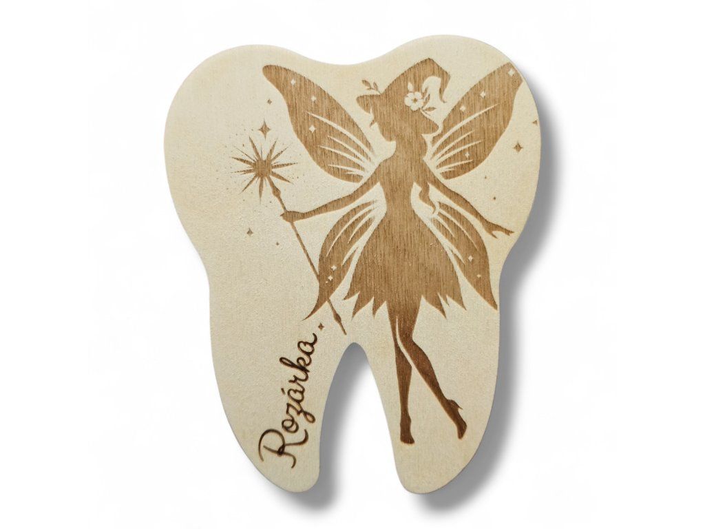 Dřevěná krabička na první mléčné zoubky s motivem víly – vyřezaná z březové překližky, rozměry cca 9,5 × 12 × 1,5 cm. Česká ruční výroba Gravilan.