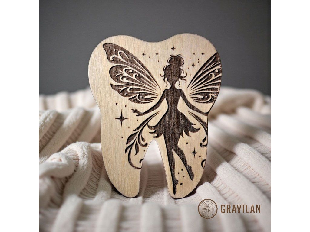 Personalizovaná dřevěná krabička na mléčné zoubky s motivem víly a jménem na přání. Ruční výroba z březové překližky v české dílně GRAVILAN®. Kouzelná památka na dětství.