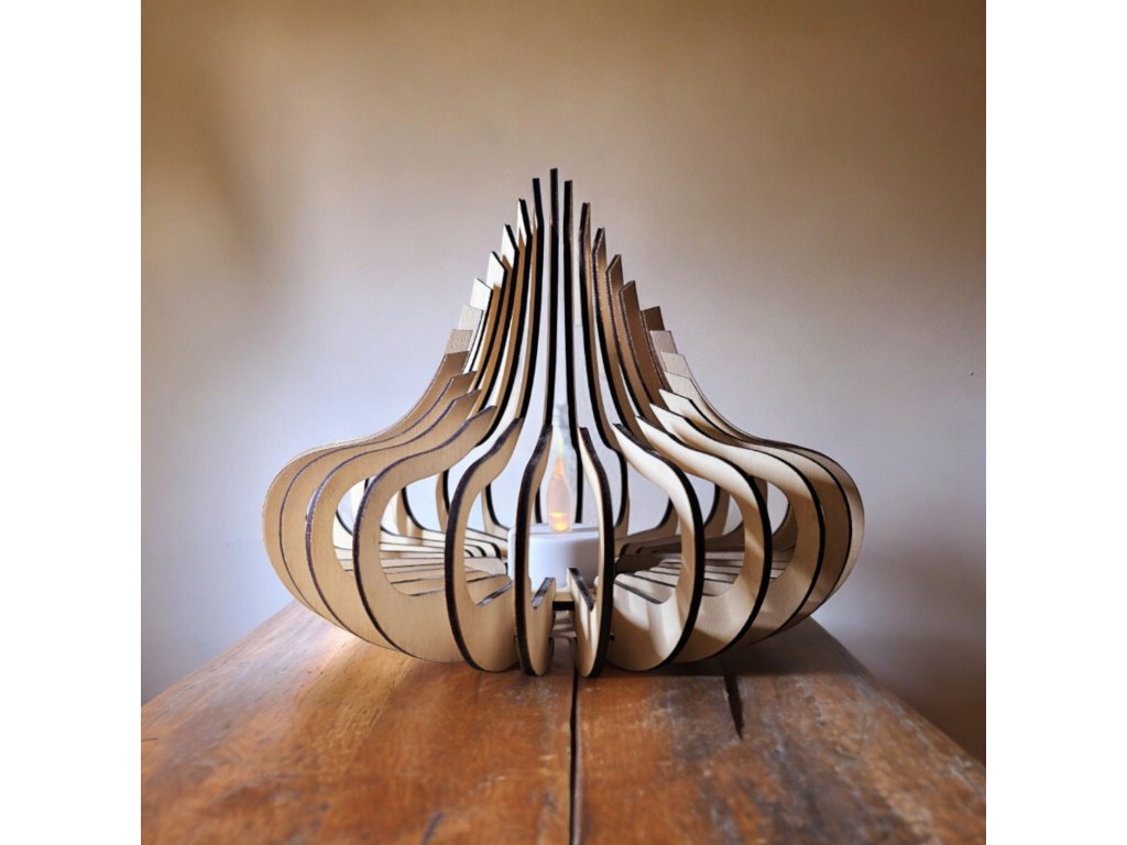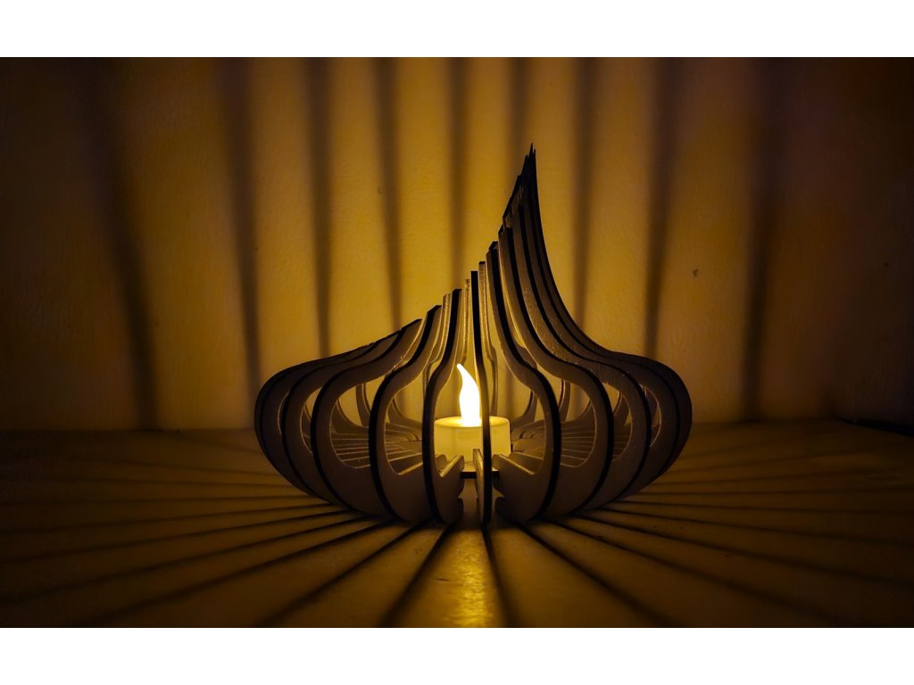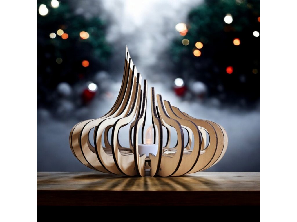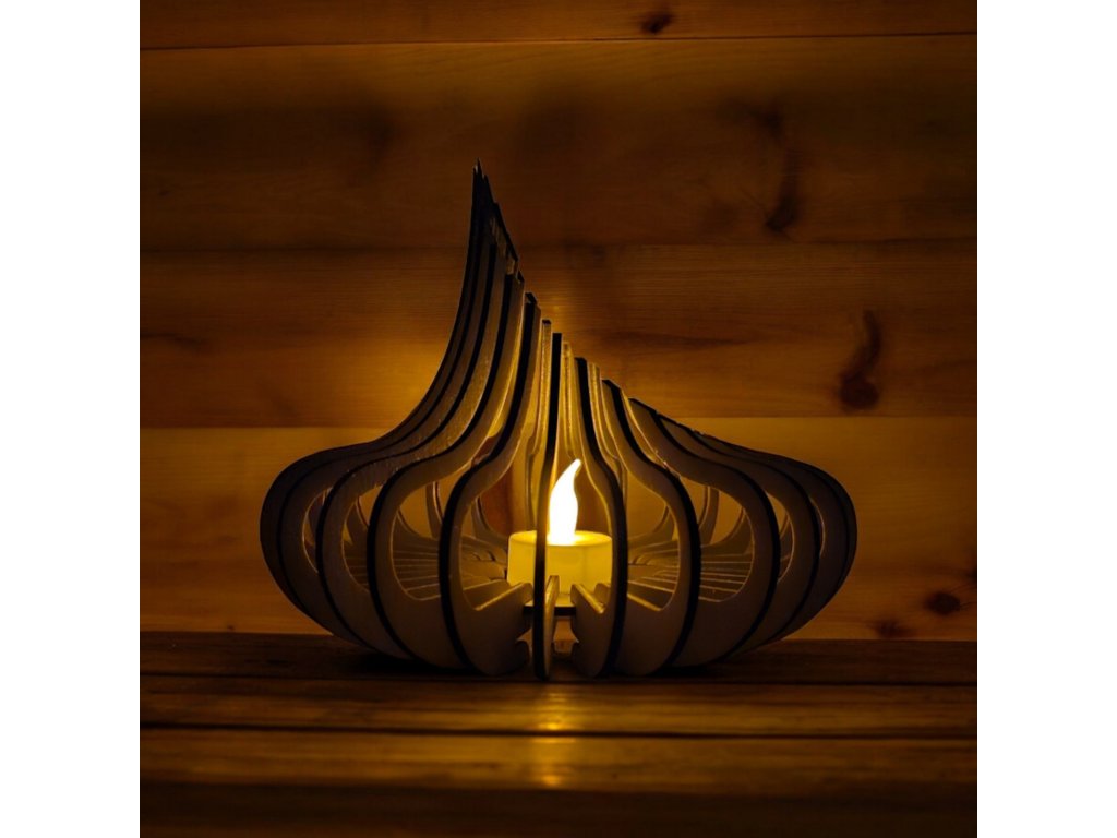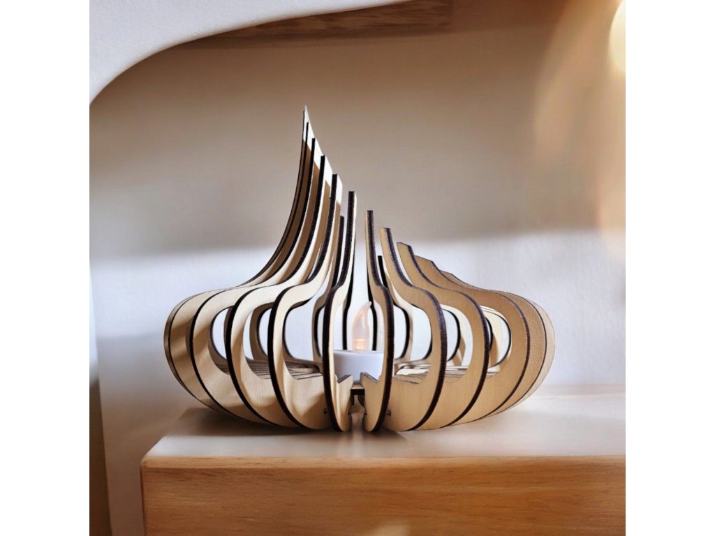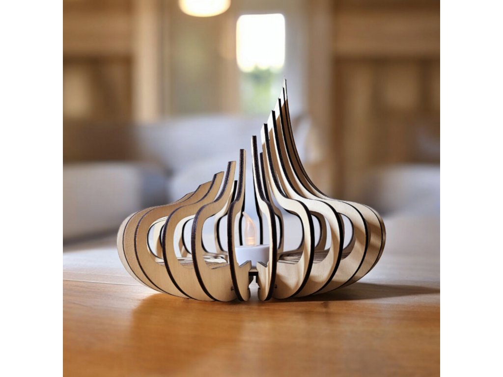 Designový LED svícen LOTOS z březové překližky. Originální dřevěná dekorace s jemným světlem pro útulný interiér.