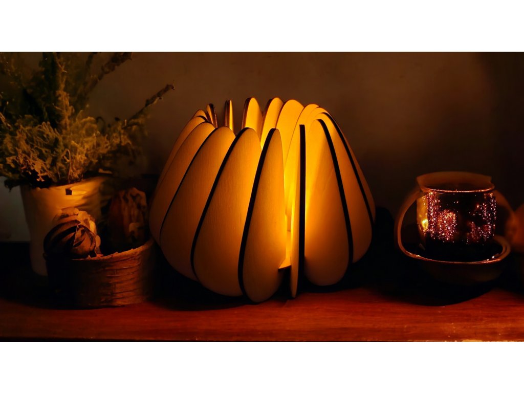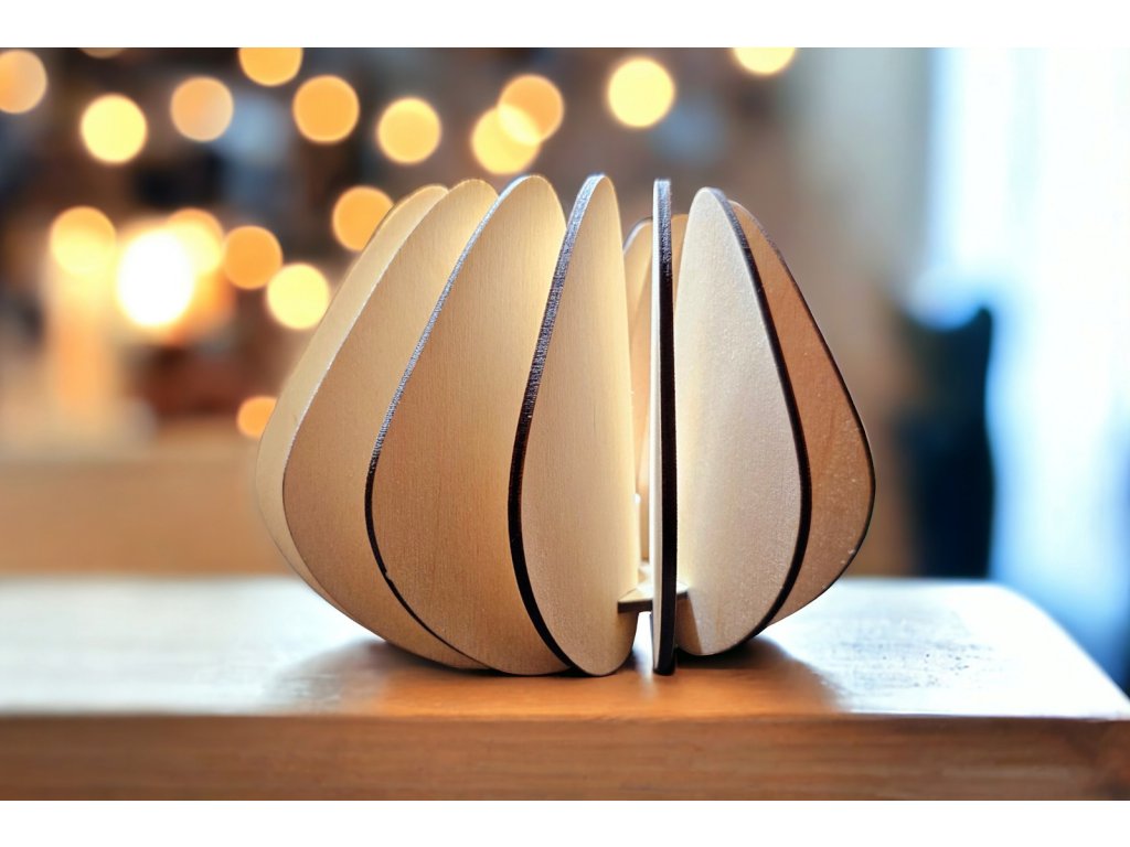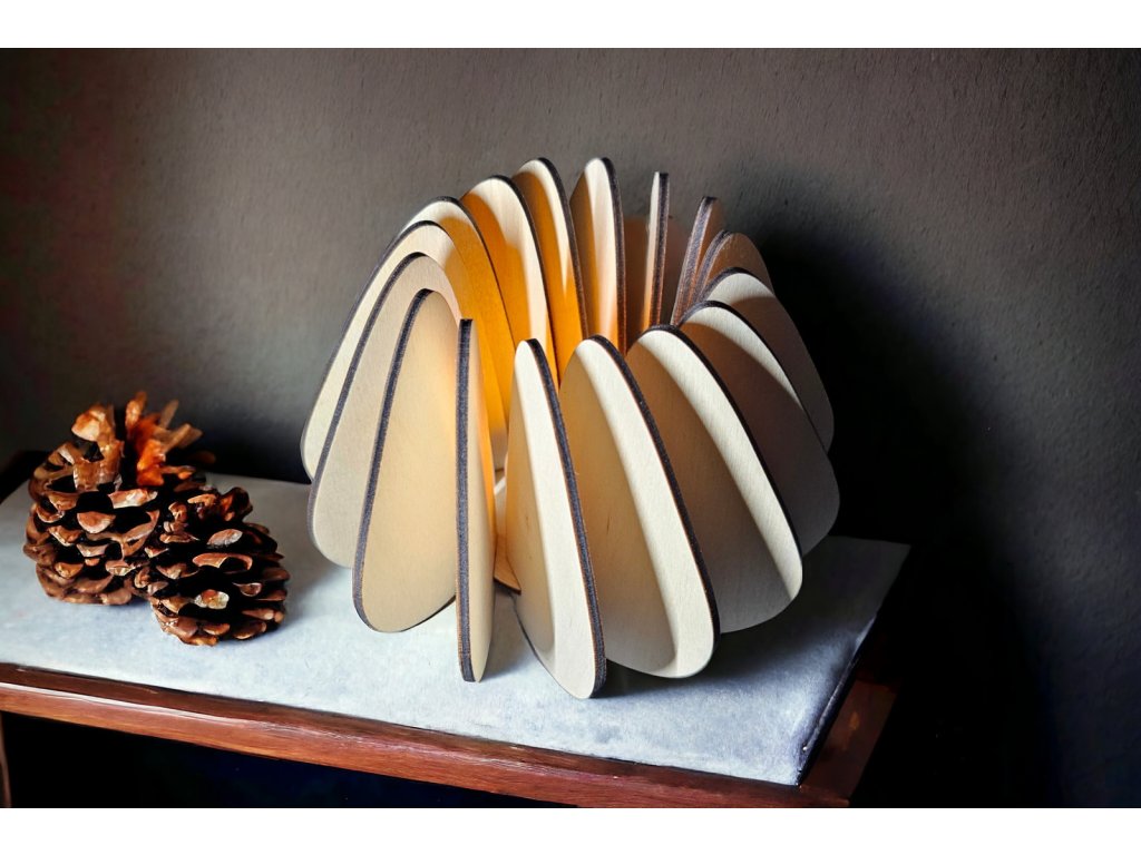 Designový LED svícen z březové překližky v přírodní béžové barvě. Originální doplněk pro útulnou atmosféru domova.