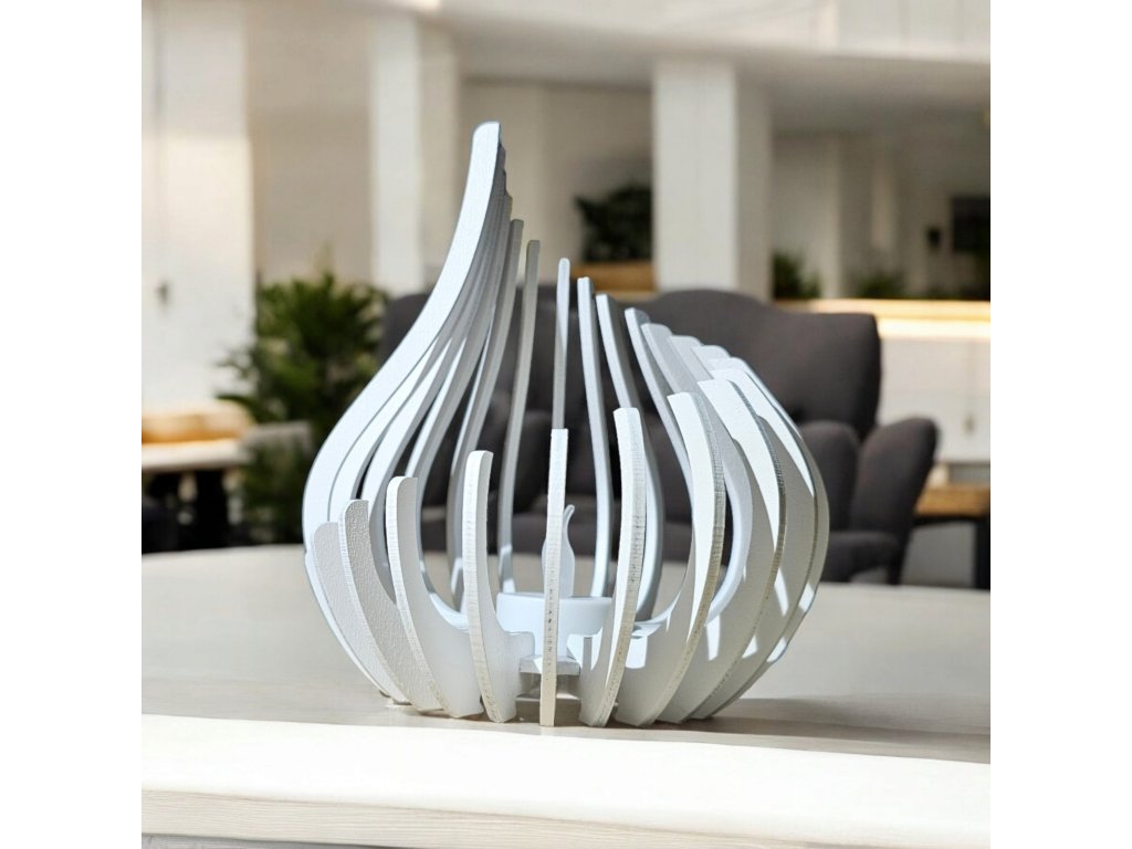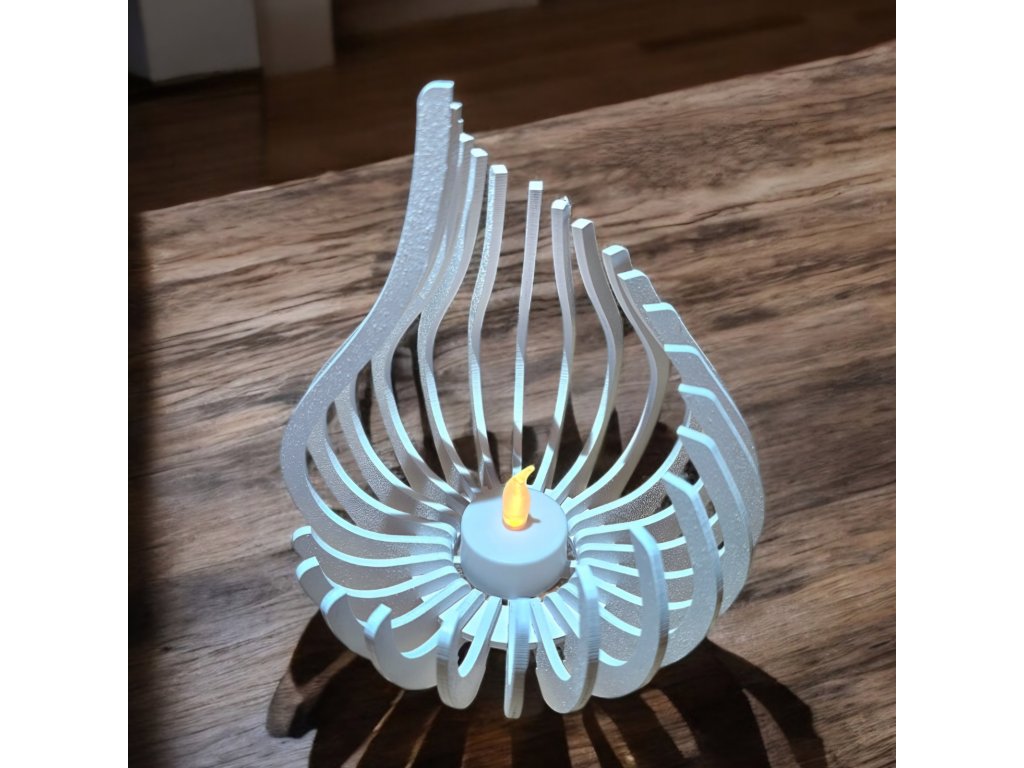 Designový LED svícen PLAMEN v bílé lesklé barvě. Vyroben z březové překližky, výška cca 16 cm. Dodává se včetně LED čajové svíčky a baterie.