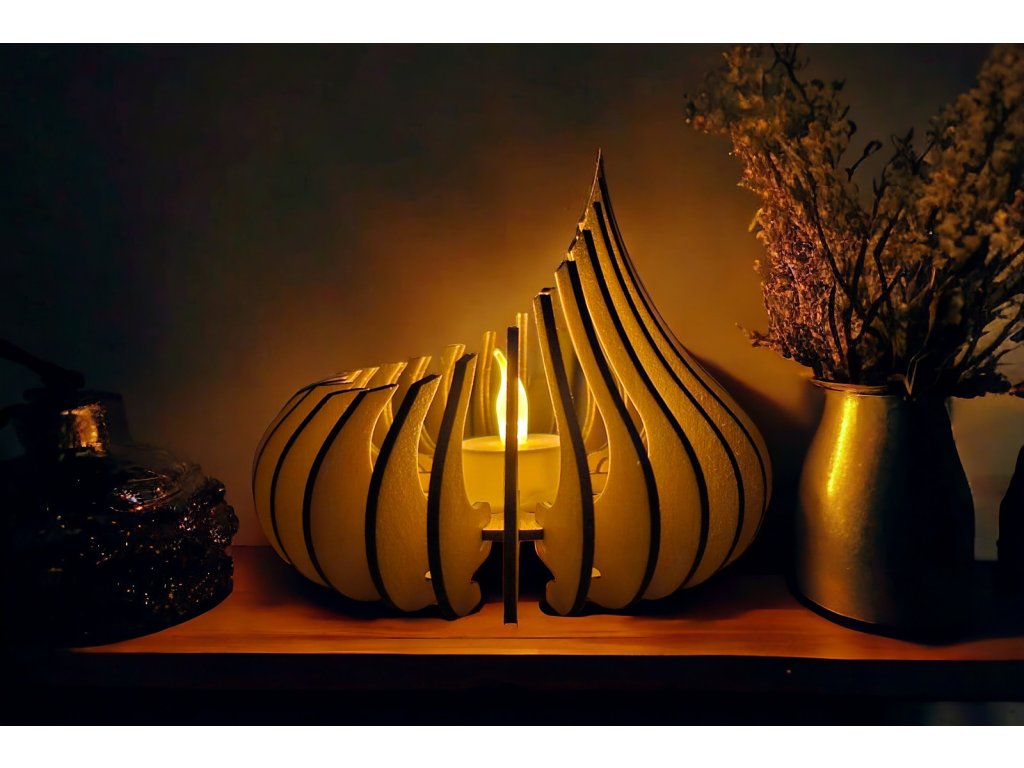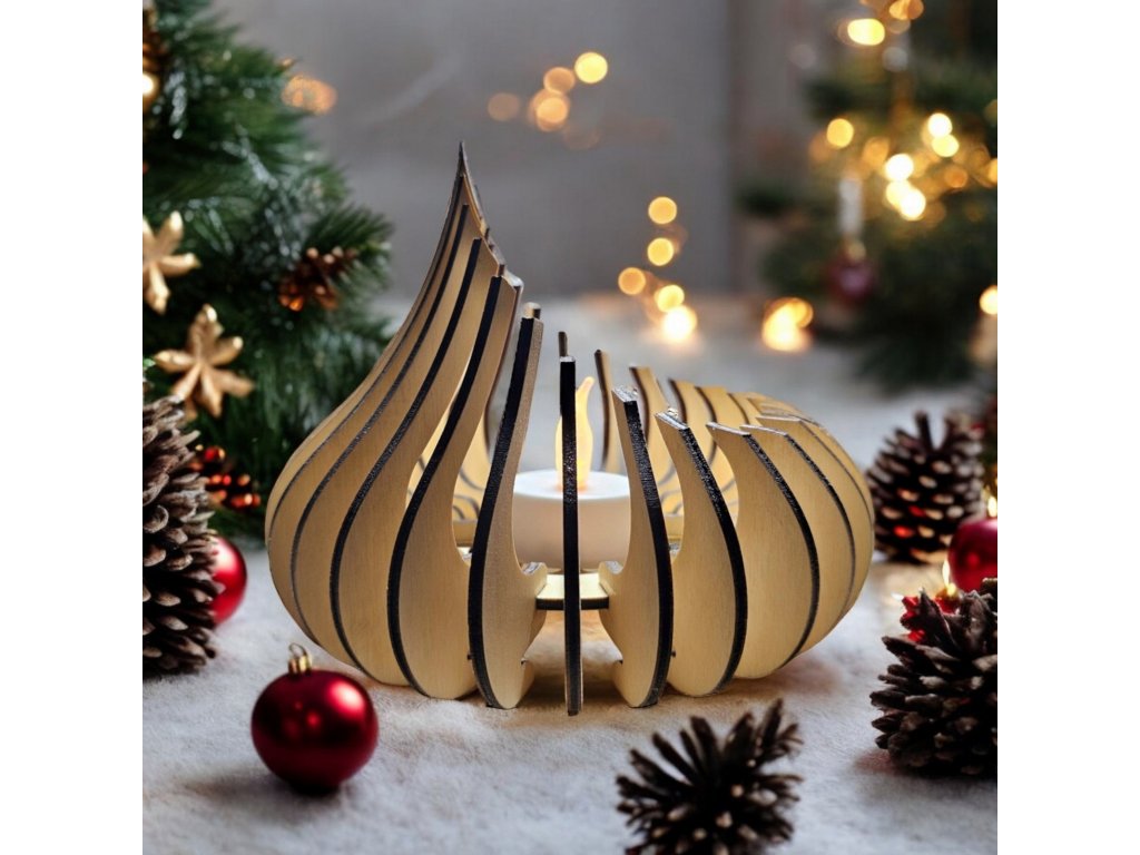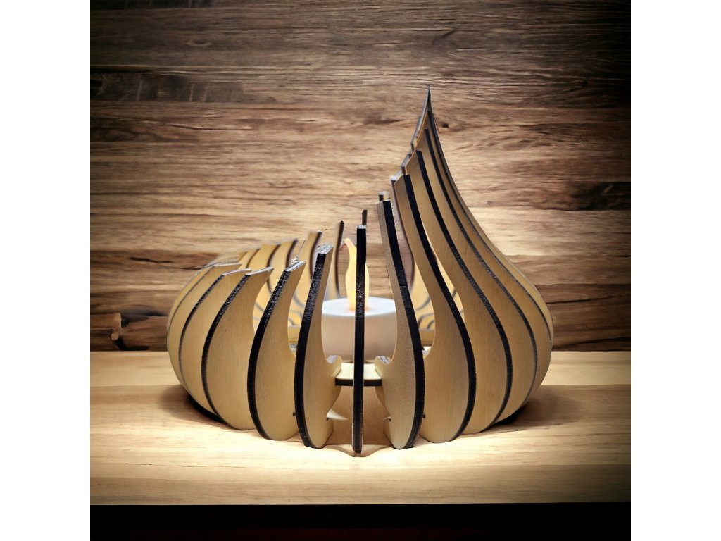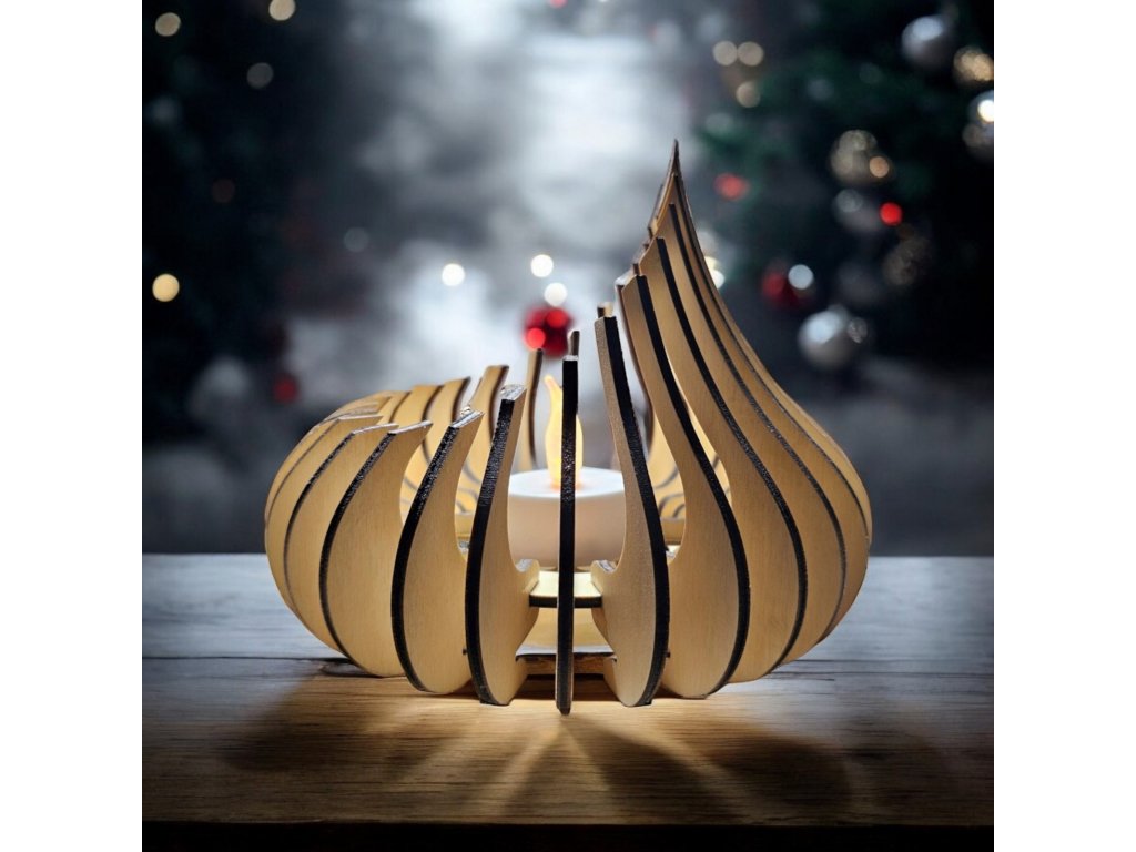 Designový LED svícen PERLA z březové překližky. Výška cca 12 cm, průměr cca 15 cm. Součástí je LED čajová svíčka včetně baterie.