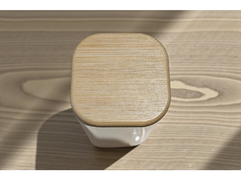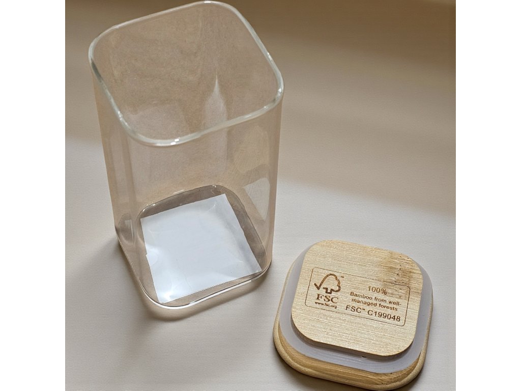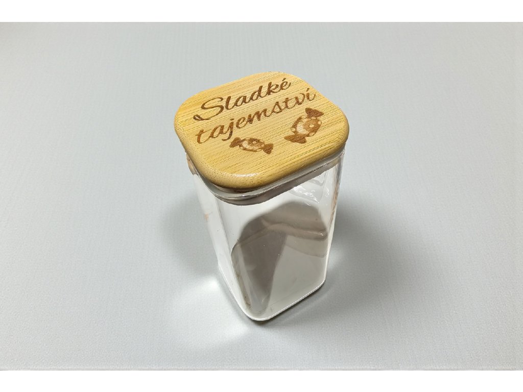 Skleněná dóza s bambusovým víčkem a možností gravírování. Praktická věc, která díky osobnímu detailu přirozeně zapadne do každodenního používání.