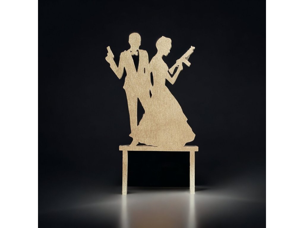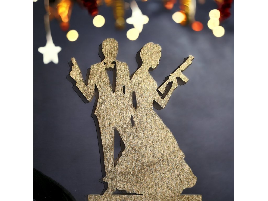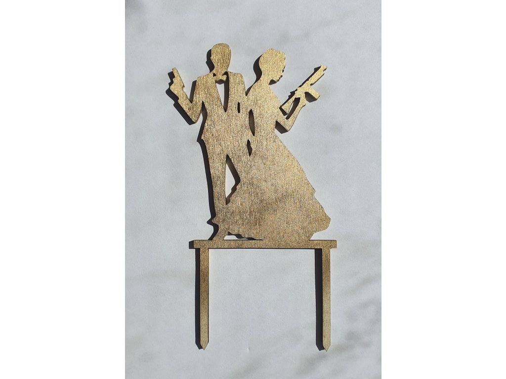 Svatební dortový zápich ženich a nevěsta z dřevěné překližky. Elegantní zlatá dekorace na svatební dort i slavnostní tabuli.