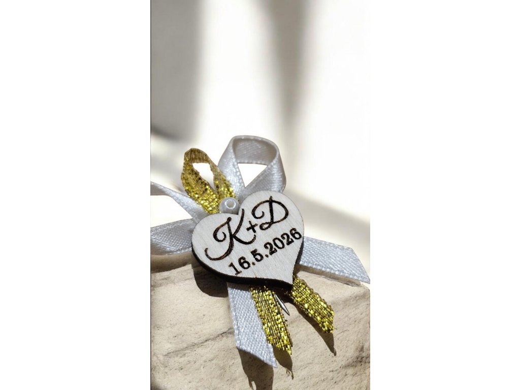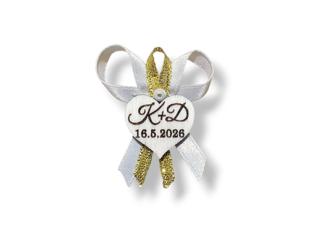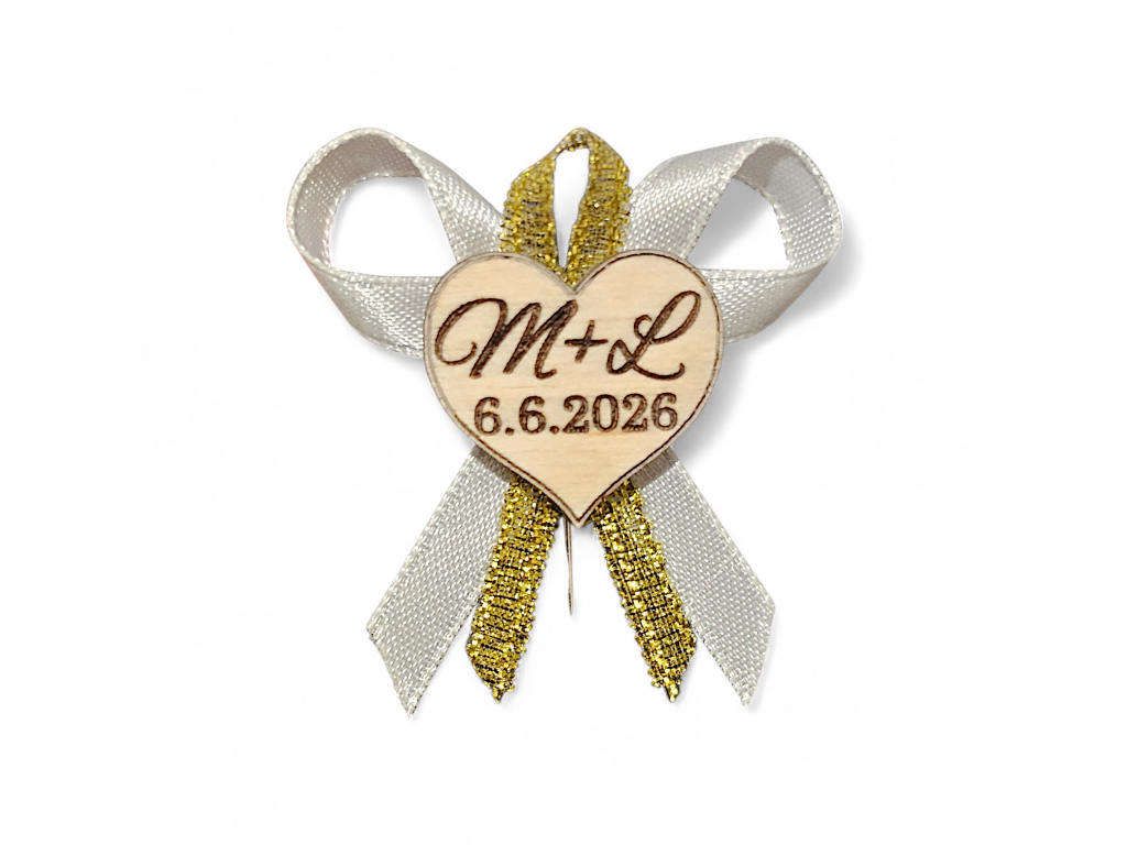 Svatební vývazky (voničky) v bílo-zlaté barvě s perličkou a dřevěným srdíčkem s iniciály novomanželů a datem svatby. Šířka vývazku 35 mm, opatřeny špendlíkem pro snadné připevnění na klopu.