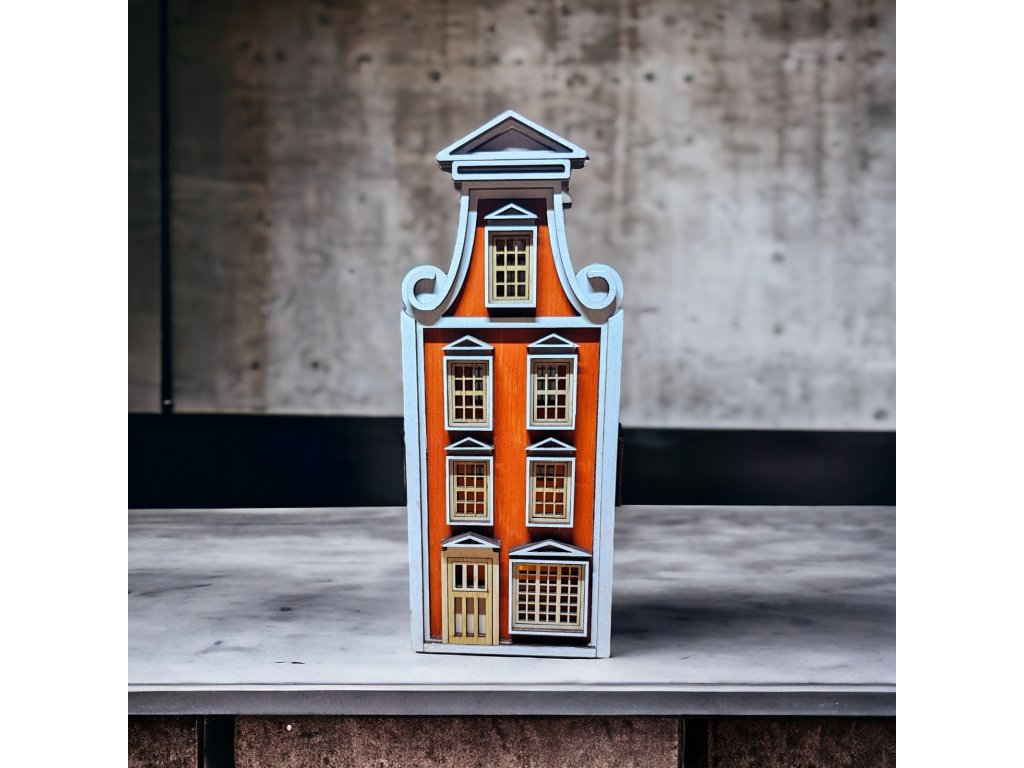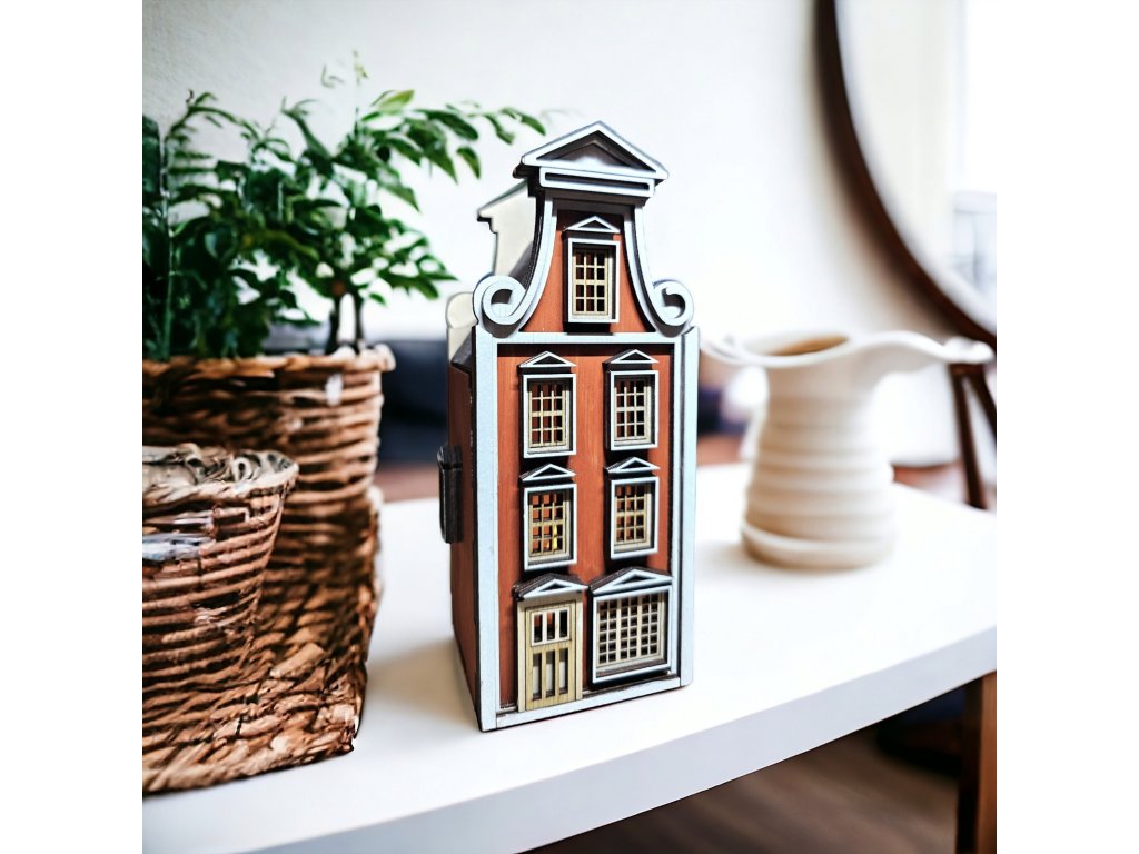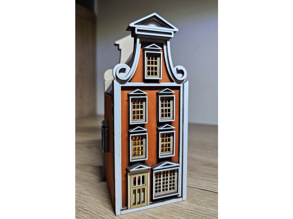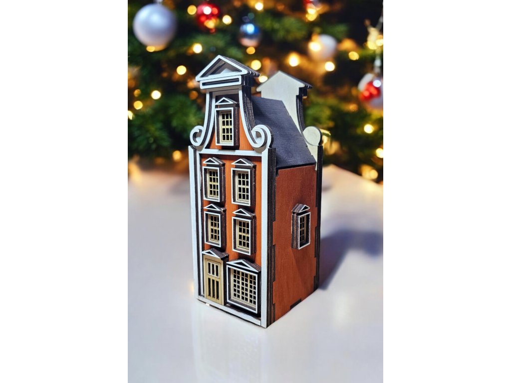 Dřevěný svítící domeček Amsterdam v mahagonové barvě včetně LED světla a baterie. Precizně vyřezáno laserem z březové překližky.
