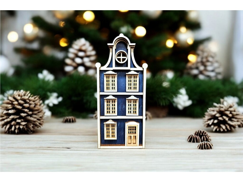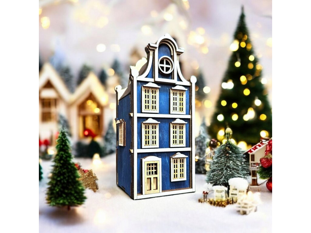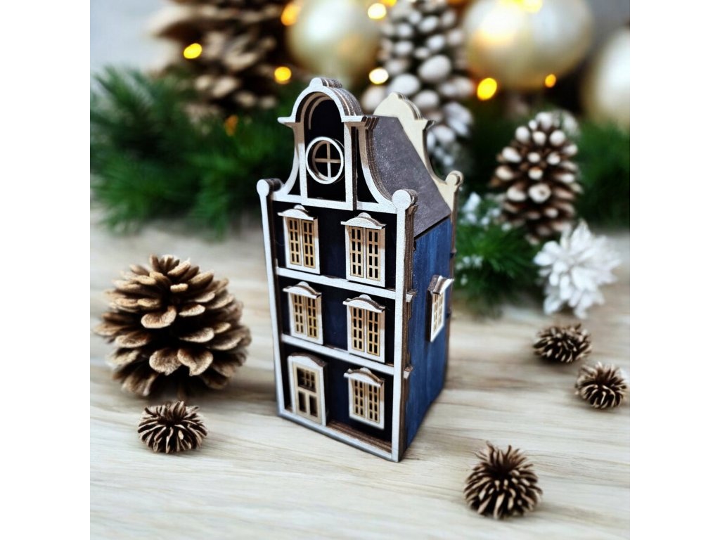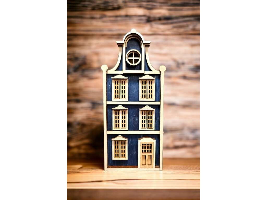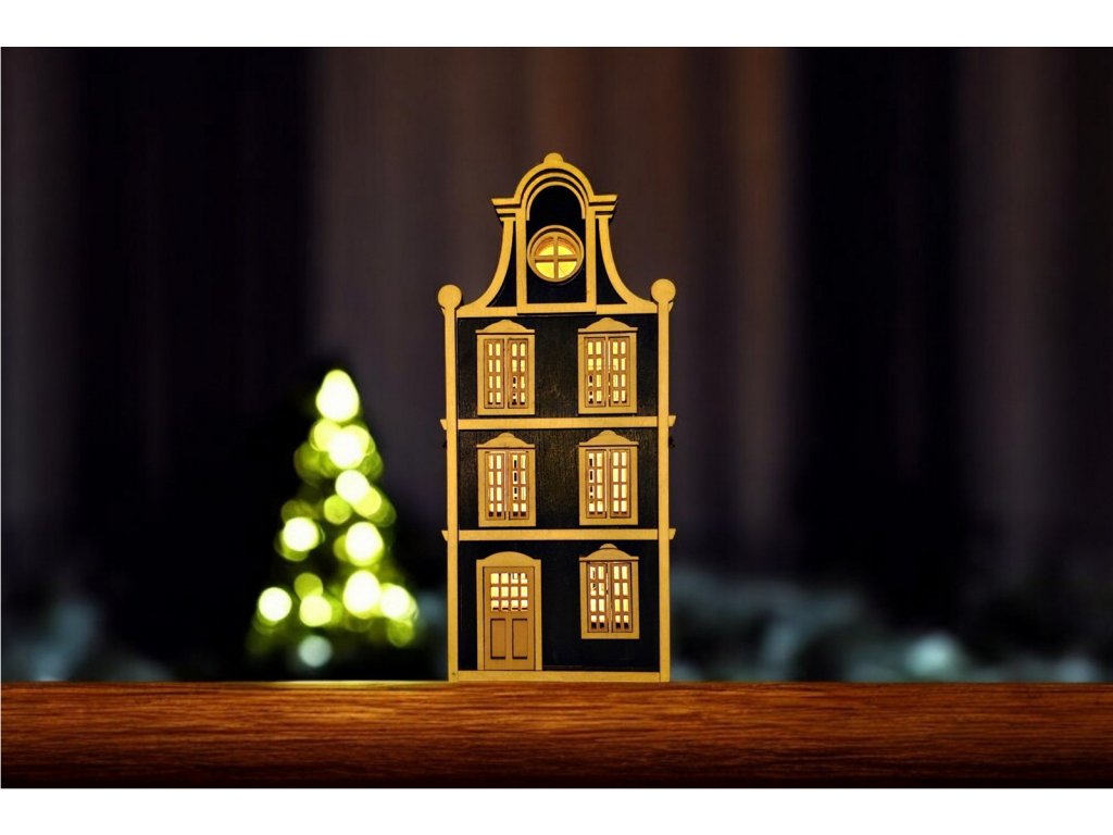 Dřevěný svítící domeček inspirovaný architekturou Amsterdamu. Vyrobený z kvalitní březové překližky, dodáváno včetně LED světla a baterie.