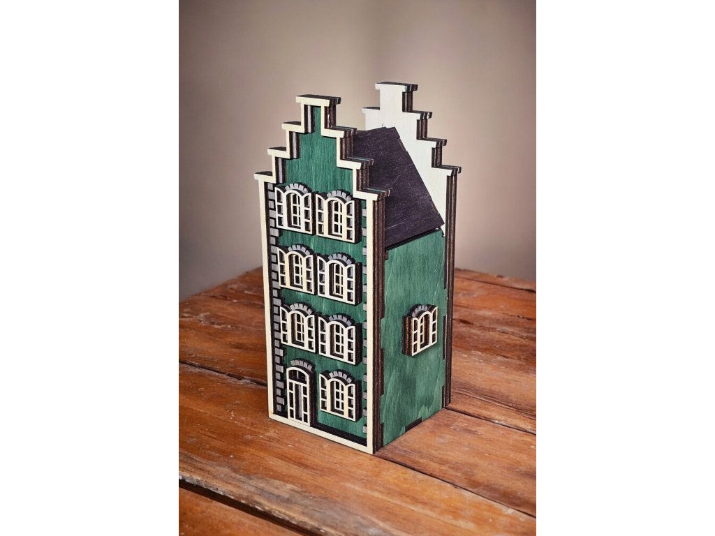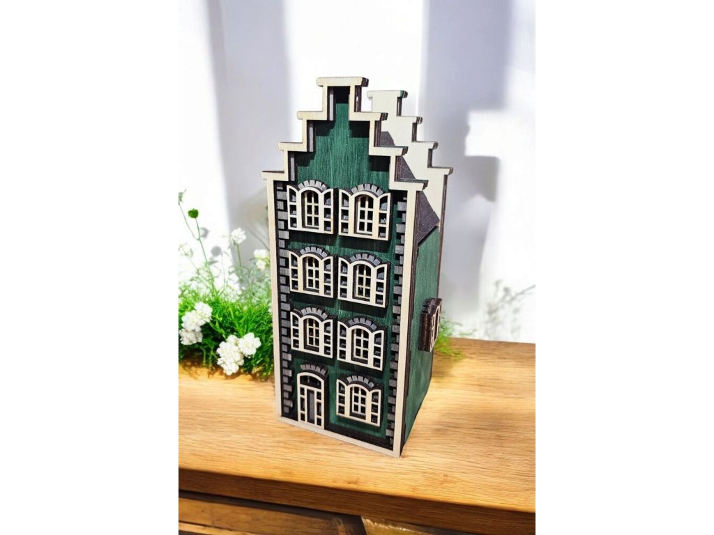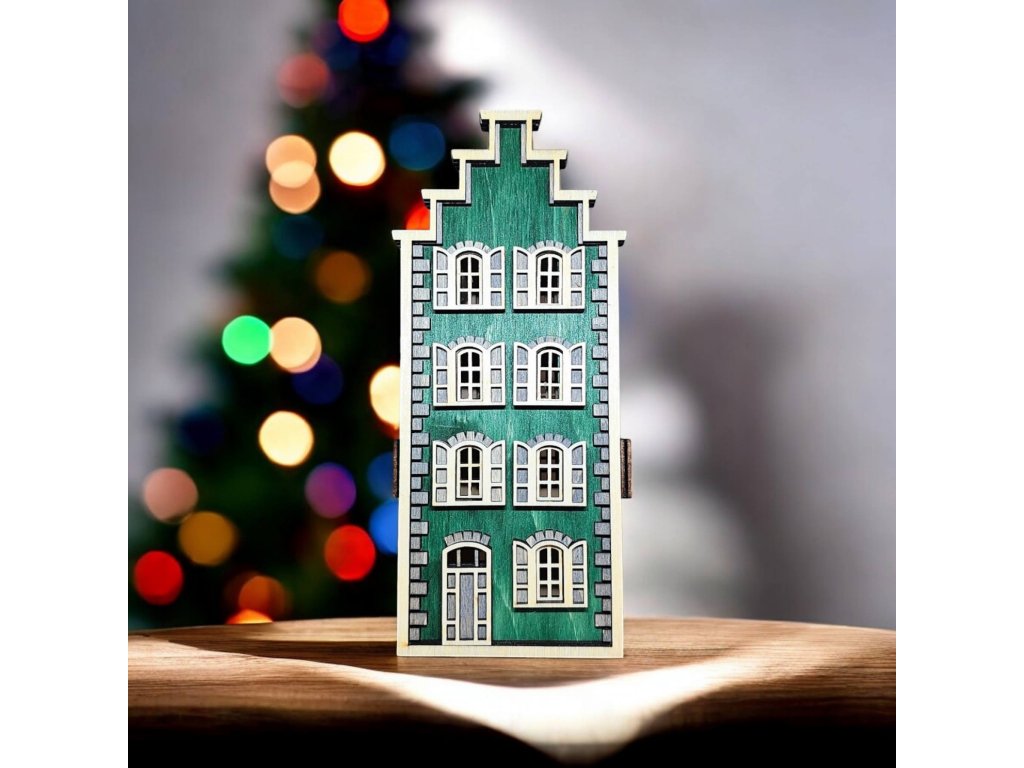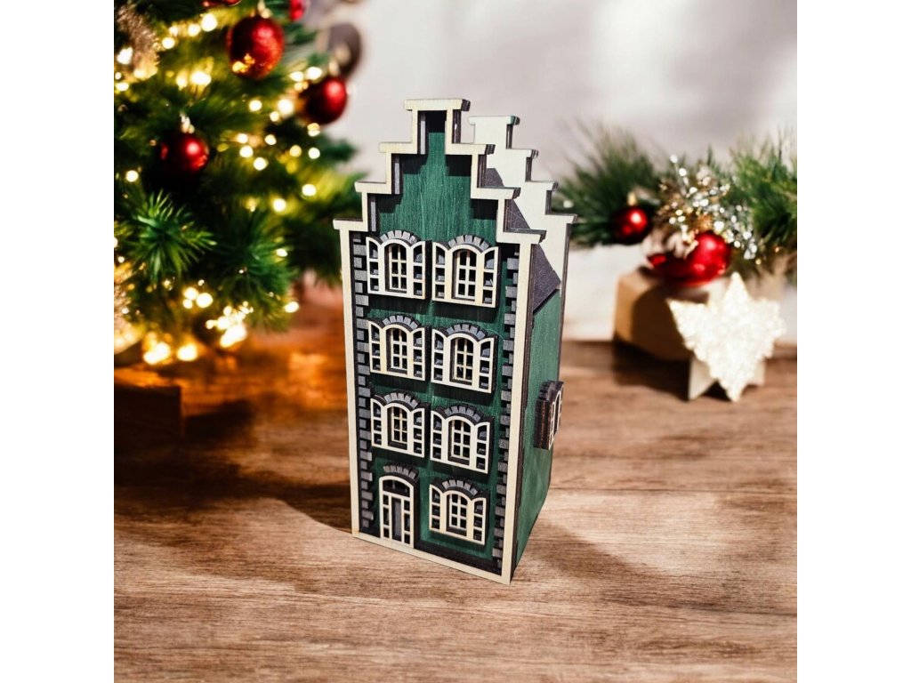 Dřevěný svítící domeček Amsterdam v zeleném provedení. Precizní laserový výřez z březové překližky, součástí LED světlo s baterií.