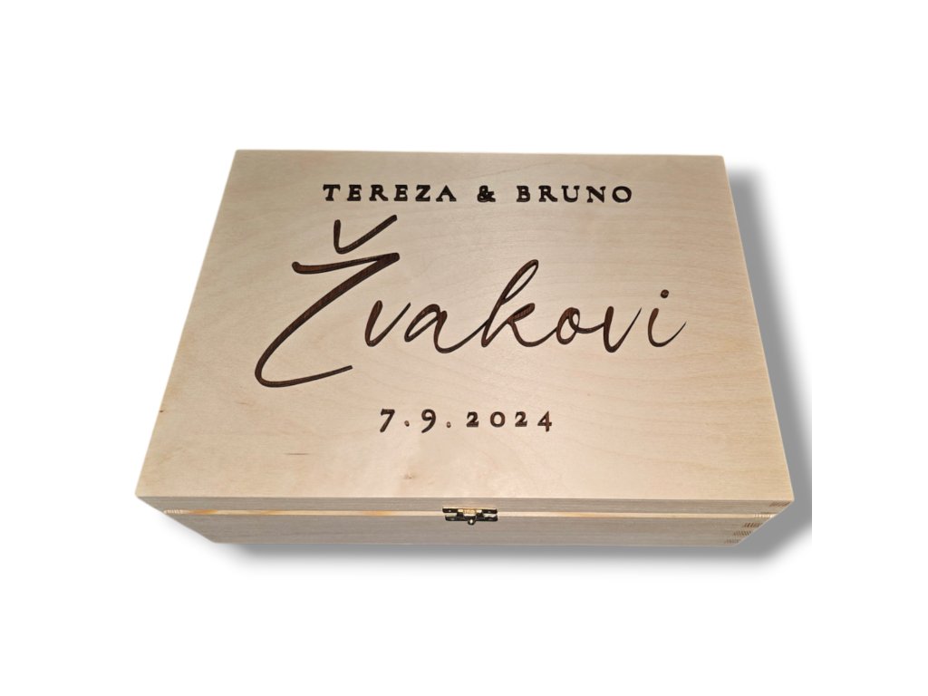 Elegantní dřevěná truhla na svatební přání vyrobená z borovicového dřeva a březové překližky. S vlastním nápisem nebo jmény vyřezanými laserem. Ideální jako svatební box na obálky, vzkazy a drobné dárky.