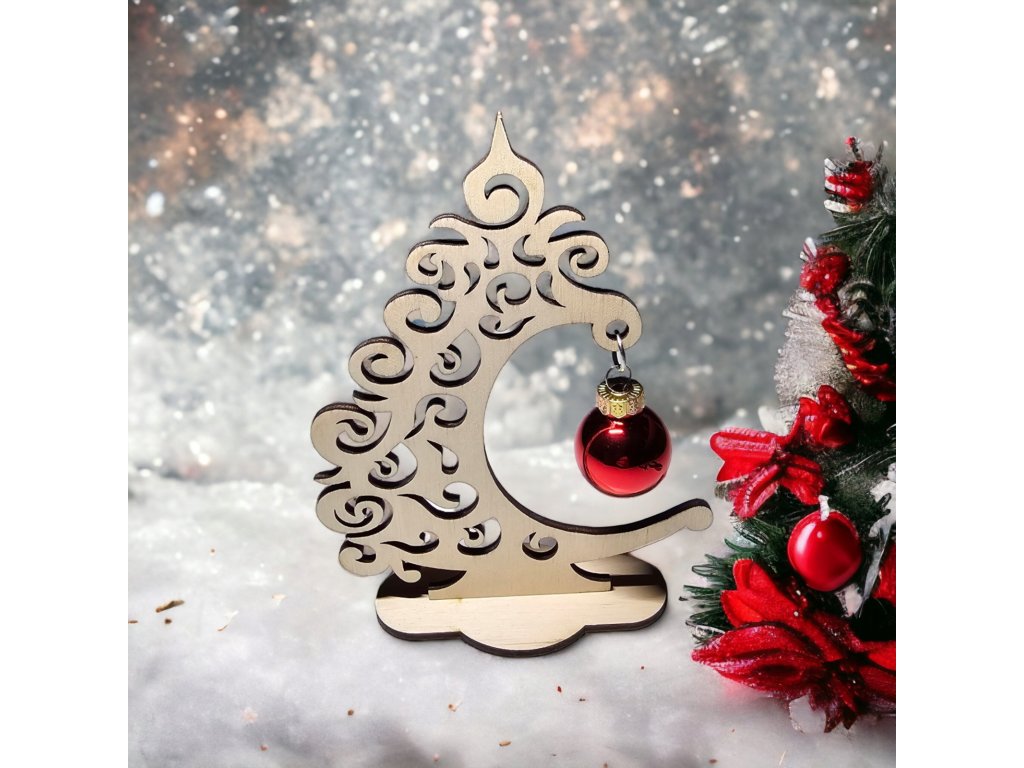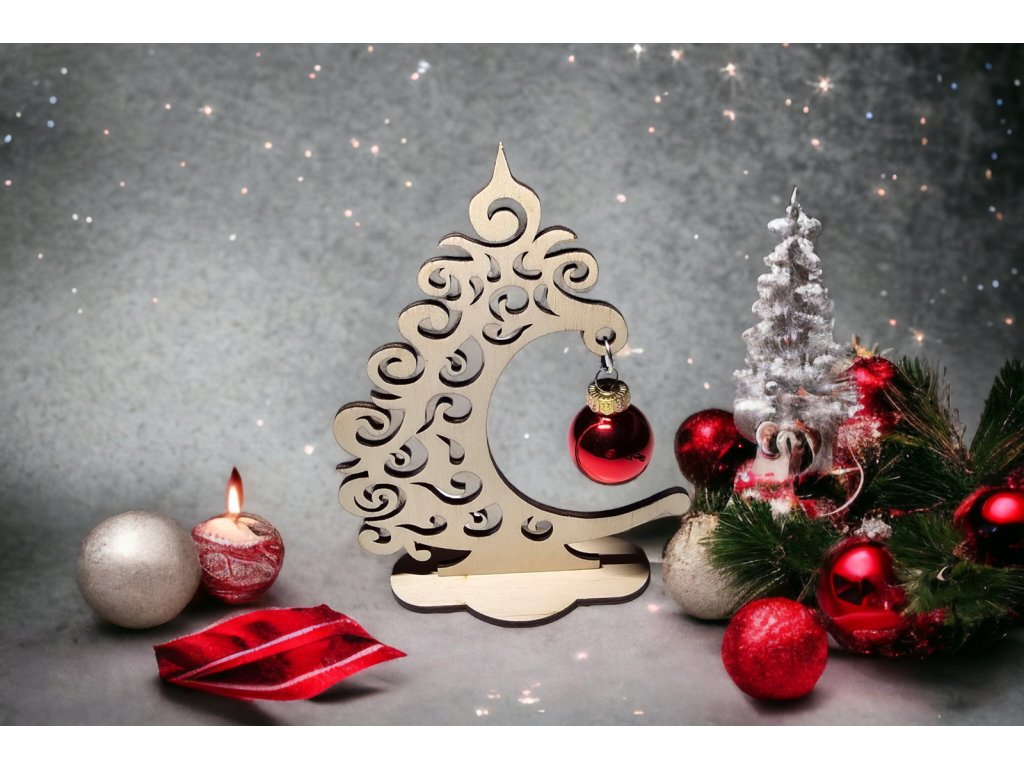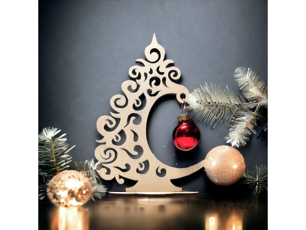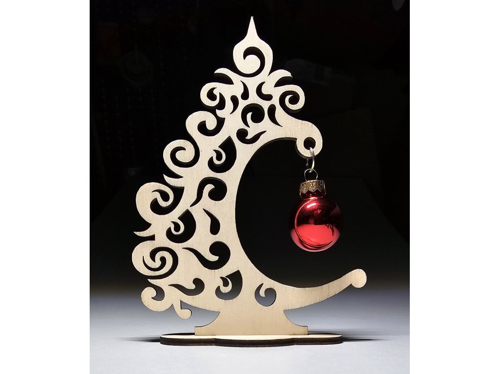 Dřevěný vánoční stromeček s ozdobou od Gravilan. Ručně vyrobený z březové překližky, vhodný na poličku, stůl nebo parapet. Přírodní vánoční dekorace na stůl pro útulnou vánoční atmosféru.