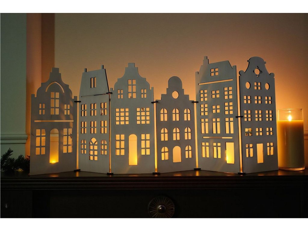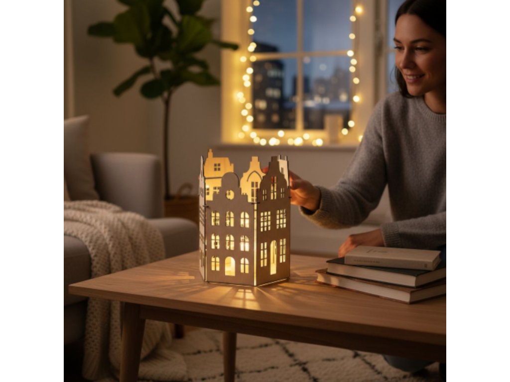 Tato elegantní vánoční vesnička kombinuje přírodní dřevěný materiál s jemným teplým LED světlem, čímž vytváří krásnou sváteční atmosféru v každém interiéru.