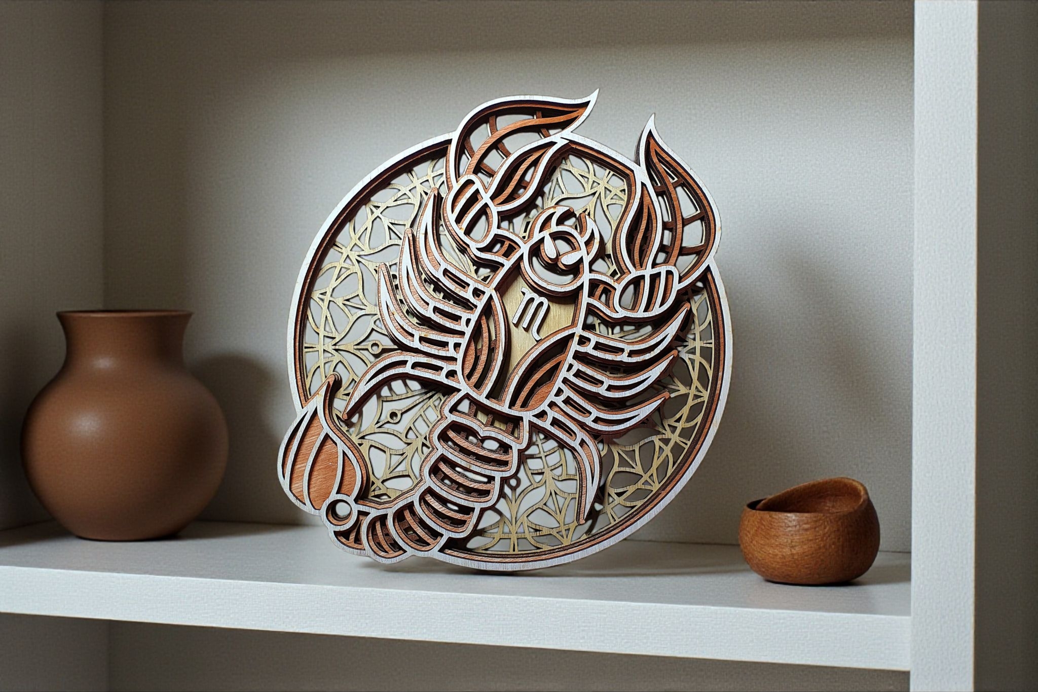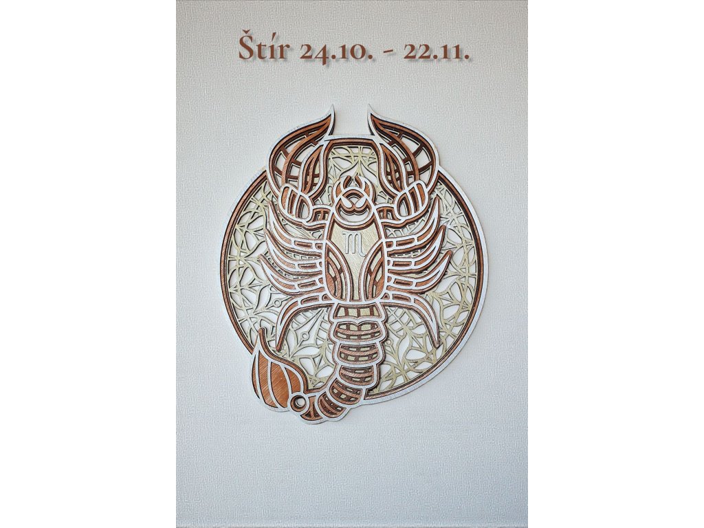 Ručně vyráběný dřevěný obraz znamení zvěrokruhu Štír. Vrstvený 3D efekt z březové překližky, precizní laserové zpracování. Originální dekorace i krásný osobní dárek.